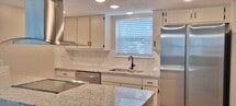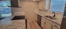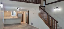 This two level corner unit features two large bedrooms with oversized closets, a loft/study off master bedroom, soaring ceilings in the living area l, updates include granite in kitchens and baths, high end stainless appliances, washer and dryer in unit, 2 baths, single garage with electric opener, lawns are maintained by the association. Total electric unit with central heat and cooling. No pets allowed.
