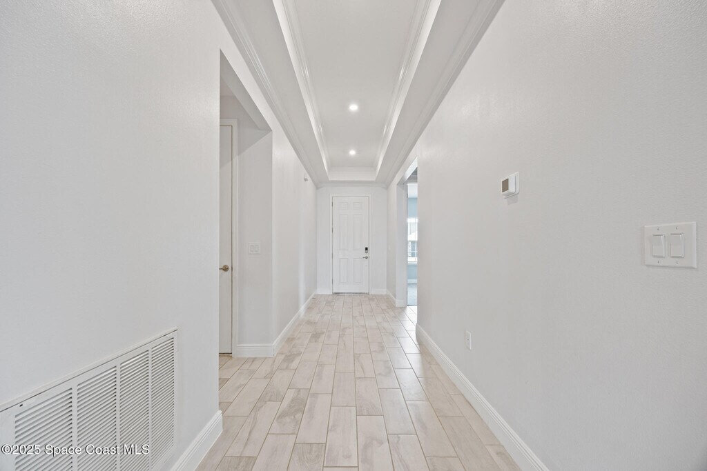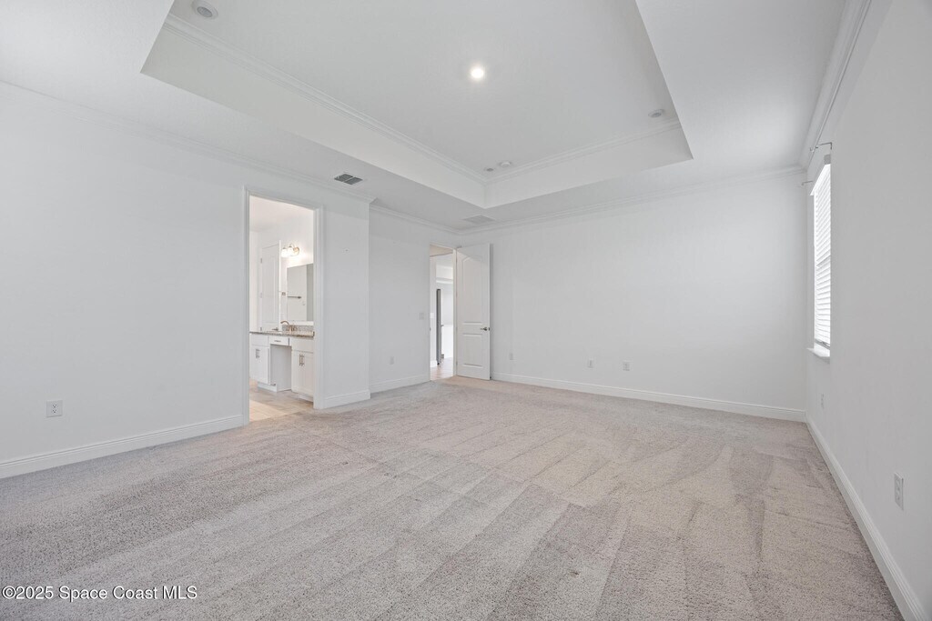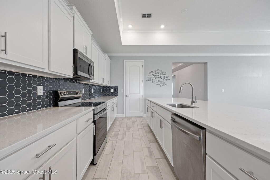 Located in the highly sought-after gated Courtyards at Waterstone neighborhood is this impeccably maintained,generously upgraded,better-than-new 2023 waterfront 4-bedroom,3-bath,3-car garage home with a flexible den ideal as a 5th bedroom,office,or gym. The designer kitchen features 42'' soft-close cabinets,granite countertops,tile backsplash,stainless steel appliances,and a pantry. Enjoy custom lighting,tile floors,tray ceilings,crown molding,laundry cabinetry with washer & dryer,and blinds throughout. Step outside to a covered patio with peaceful lake views,lush landscaping,full irrigation,and stone exterior accents. Resort-style living with clubhouse and pool,just minutes from I-95. Don't miss your chance to live in this beautifully upgraded waterfront retreat!