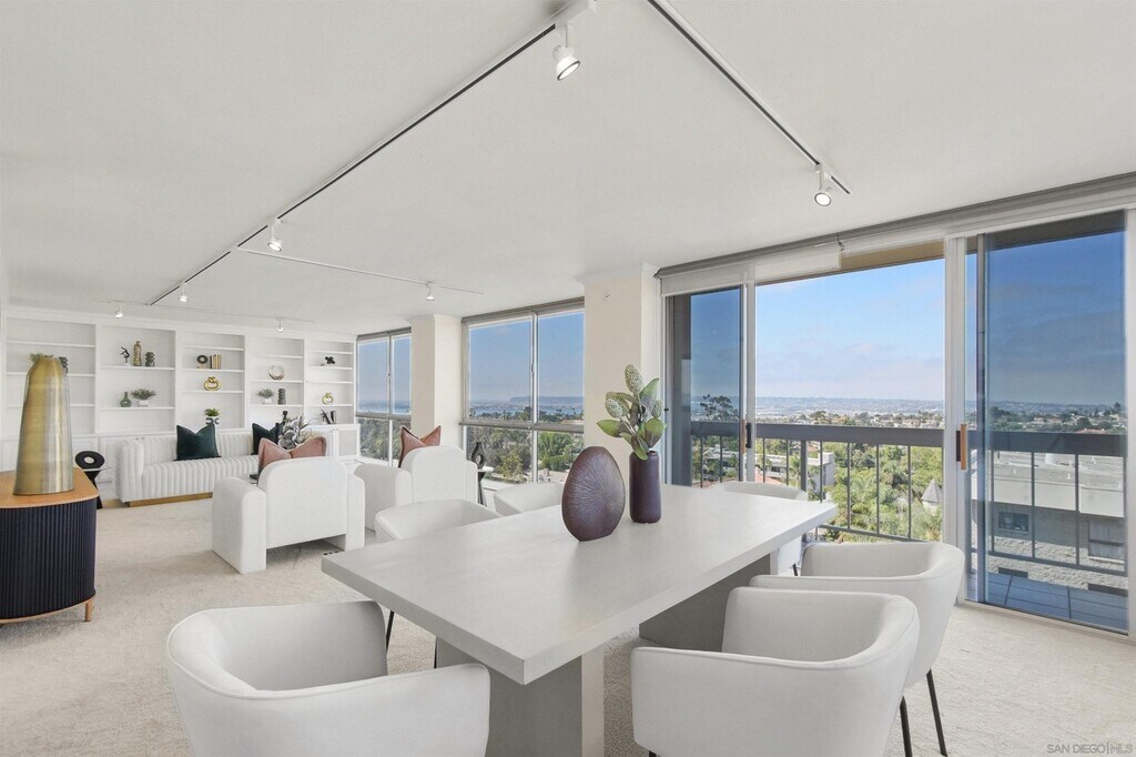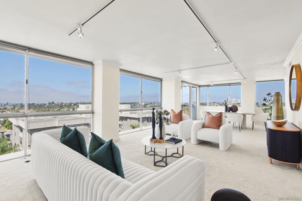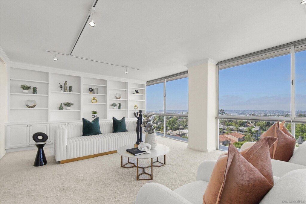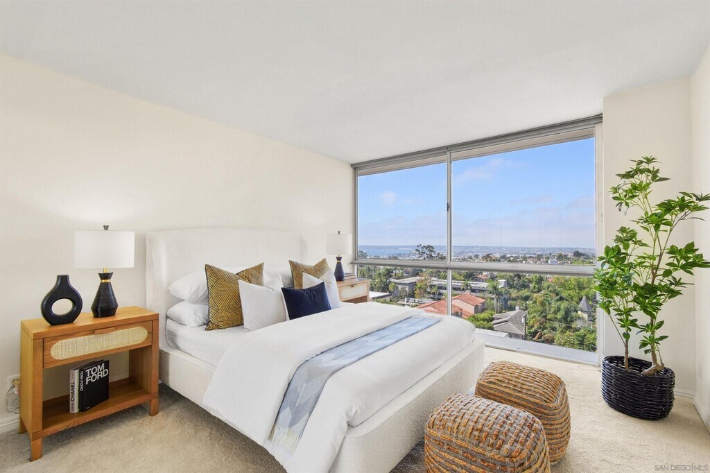 Double door entry almost immediately reveals the sweeping views framed by the floor to ceiling windows in the luxuriously spacious living/dining room. The crown jewel awaits atop the penthouse level with a "Mad-Men-esque" clubhouse/lounge/fireplace + kitchen, exercise room, billiards/ping pong recreation, and a sprawling open-air terrace with jaw-dropping bay/ocean/panoramic/dramatic views from Downtown to Pt. Loma to Mt. Soledad to Cuyamaca mountains, large enough to host 100 of your closest friends! With refreshed common areas, an impressive 2 story, stone clad entry, and true mid century modern bona fides, a discerning buyer will appreciate the intrinsic value this opportunity represents.This concrete 16 story high rise building is centrally sited in the Uptown community of Bankers Hill - The Old Globe, Balboa Park and your favorite local eating & dining establishments are all at your fingertips! Plus, the convenience of 2 assigned parking spaces with storage cabinets at each space, AND guest parking!! Embrace the high-quality lifestyle, views and comfort of this prestigious pied-a-terre address!