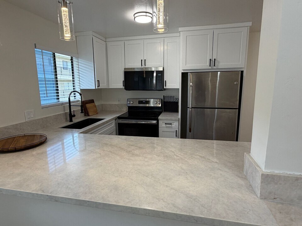 Offering 6 month lease. This renovated 2 bedroom, 2 bathroom condo offers a clean, modern interior with upgraded finishes throughout. The open layout connects the kitchen and living area, creating a bright and functional space with recessed lighting, updated flooring, and a ceiling fan. The kitchen features white shaker cabinets, stainless steel appliances, quartz style countertops, black hardware, and modern pendant lighting over the breakfast bar. The open counter design provides additional seating and flows directly into the main living space. Both bathrooms have been upgraded with contemporary tile work and modern fixtures. The primary bath includes a walk in style shower with large format tile and pebble flooring for a sleek, updated look. The community offers a gated courtyard with a pool and spa, mature landscaping, and multiple seating areas. Property Features: • 2 Bedrooms • 2 Bathrooms • 2 Parking Spaces, one covered and one uncovered • Community Laundry • Updated Kitchen and Bathrooms • Stainless Steel Appliances • Recessed Lighting • Pool and Spa Community Utilities: • Gas and Electric through SDGE, tenant responsibility • Water and Trash covered by HOA Conveniently located in San Diego with easy access to shopping, dining, and major freeways. Contact us today to schedule a showing. All prospective tenants 18+ need to submit entirely filled out applications. All applicants must complete a PetScreening profile, even if the household does not have a pet/animal. Please see the link below or contact the office. DRE #02196313