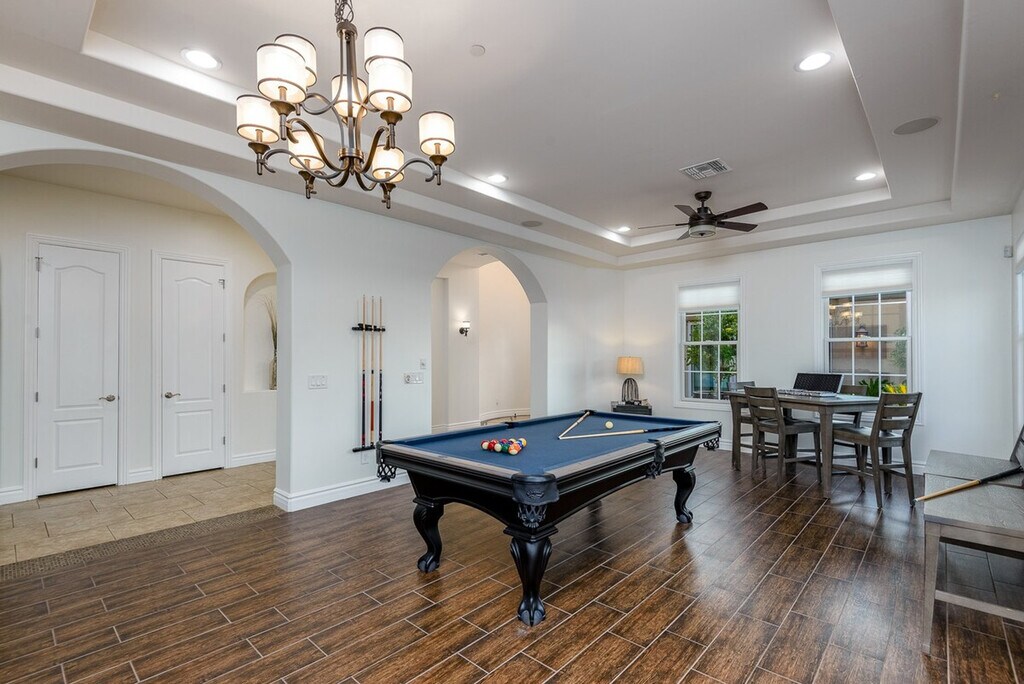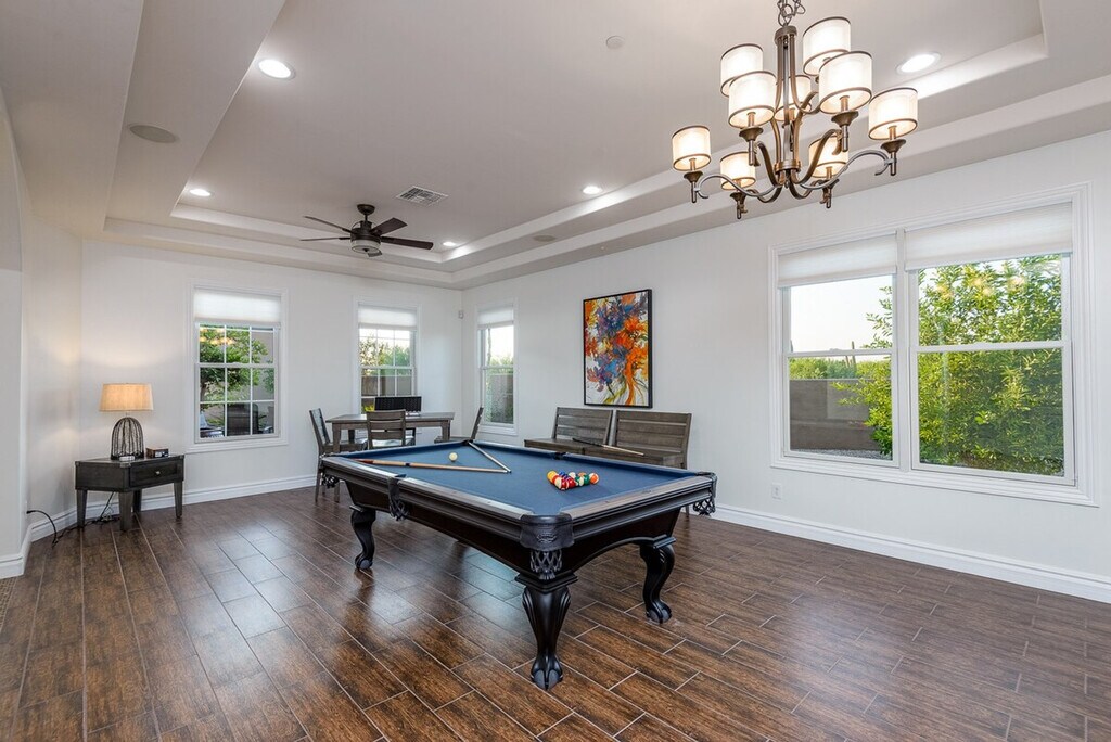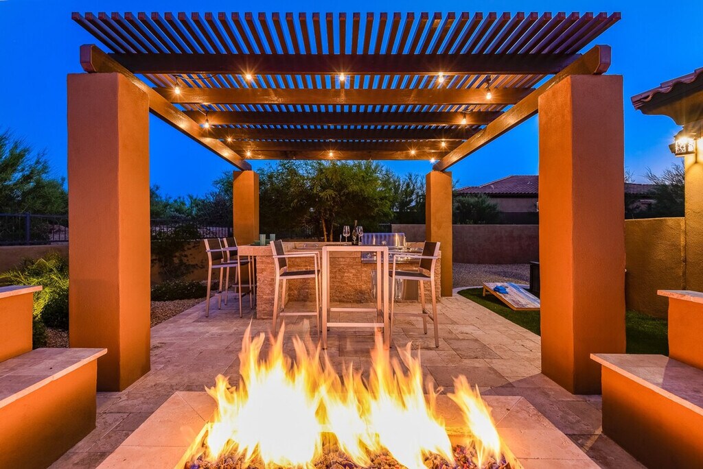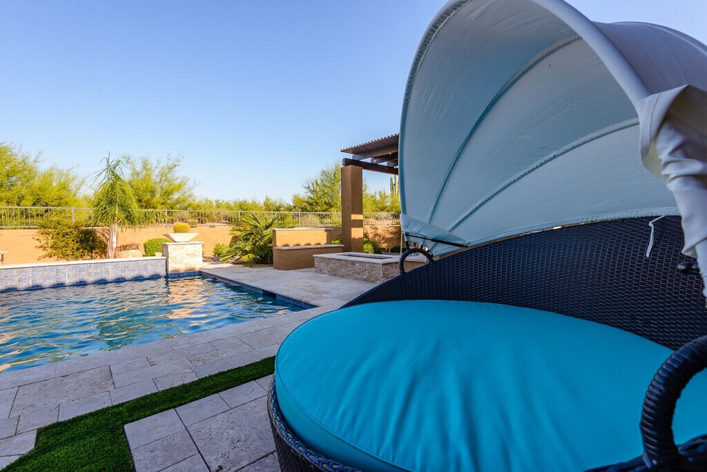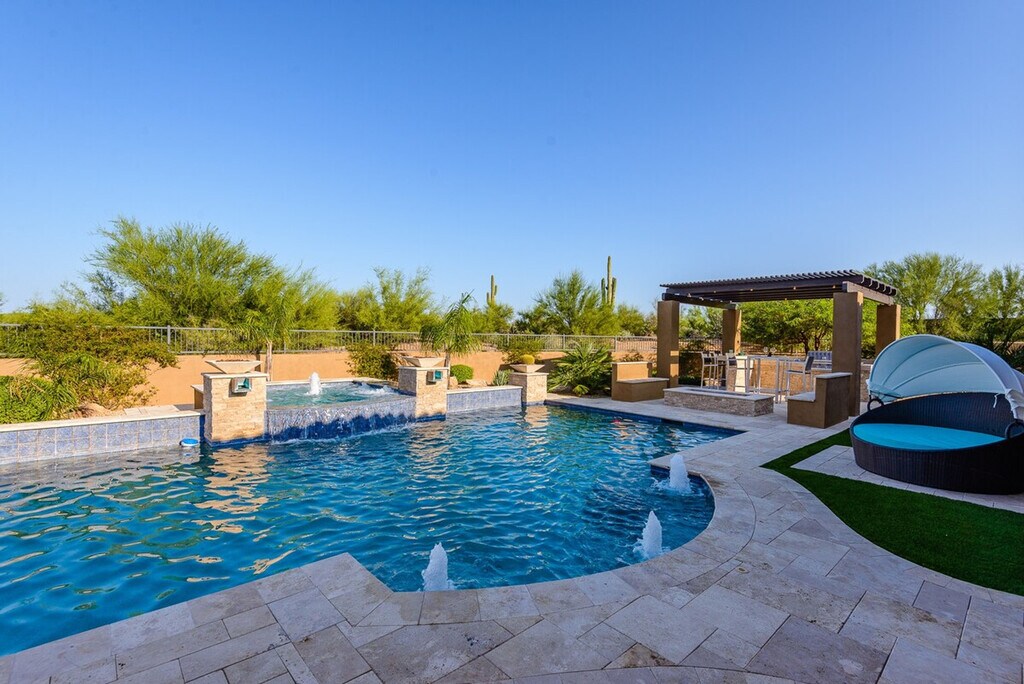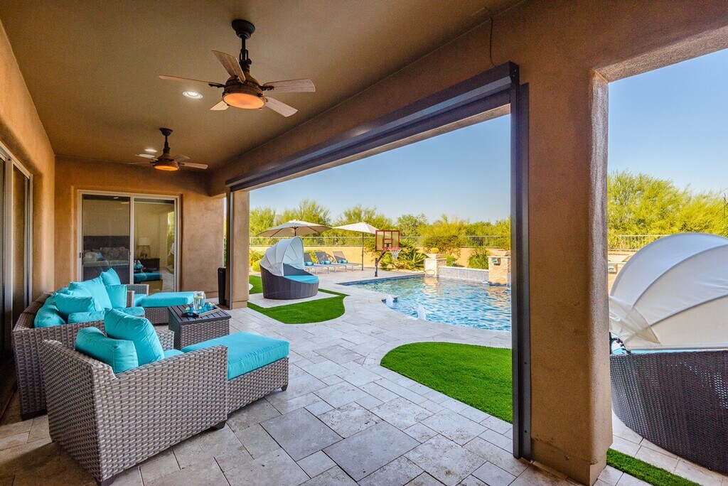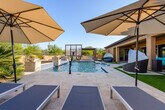 Welcome to Casa Cielo, a stunning six-bedroom retreat in North Scottsdale. This spacious home features 5.5 baths, with five of the bedrooms offering en-suite bathrooms. The property includes two king-size beds, four queen-size beds, two full beds, and two twin beds. Enjoy entertainment with TVs in every bedroom, the great room, game room, and outdoor patio. Casa Cielo is designed for relaxation and entertainment. The game room features a pool table and game table, while the backyard offers a pristine setting with an optional heated pool, hot tub, and BBQ/bar area. The outdoor space is enhanced with three fire features, a natural gas BBQ, and a corn-hole game. Inside, you'll find all linens, bath, and pool towels provided, along with free Wi-Fi. For those interested in heating the pool to 85 degrees, there is a $500 per week fee, available upon request. The heated spa is available at no additional cost. Please note that there is a $450 monthly electric cap during the summer months from June through September when booking a full month. Guests are responsible for any overages. Situated in a gated neighborhood in North Scottsdale, Casa Cielo is just minutes away from the best hiking trails, restaurants, spas, and grocery stores. This prime location ensures you're close to all the amenities you need for a comfortable stay. No pets are allowed on the property. Guests are liable for any damages caused during their stay. The rates and availability are always up to date online, and guests can confirm bookings directly on the website. [SI]