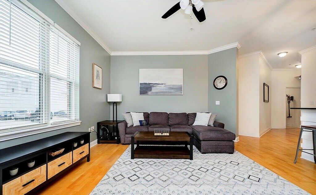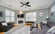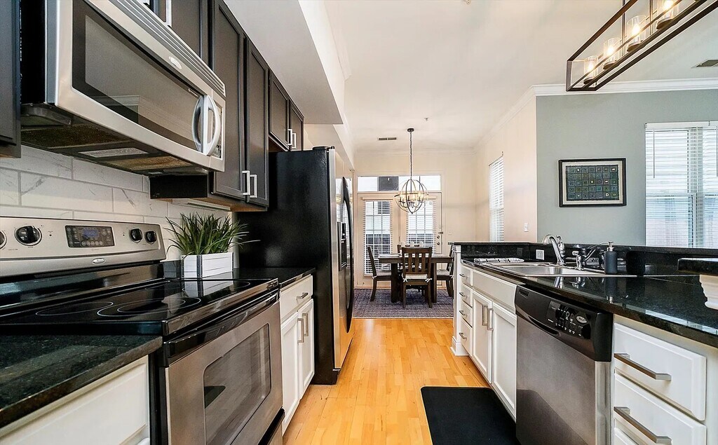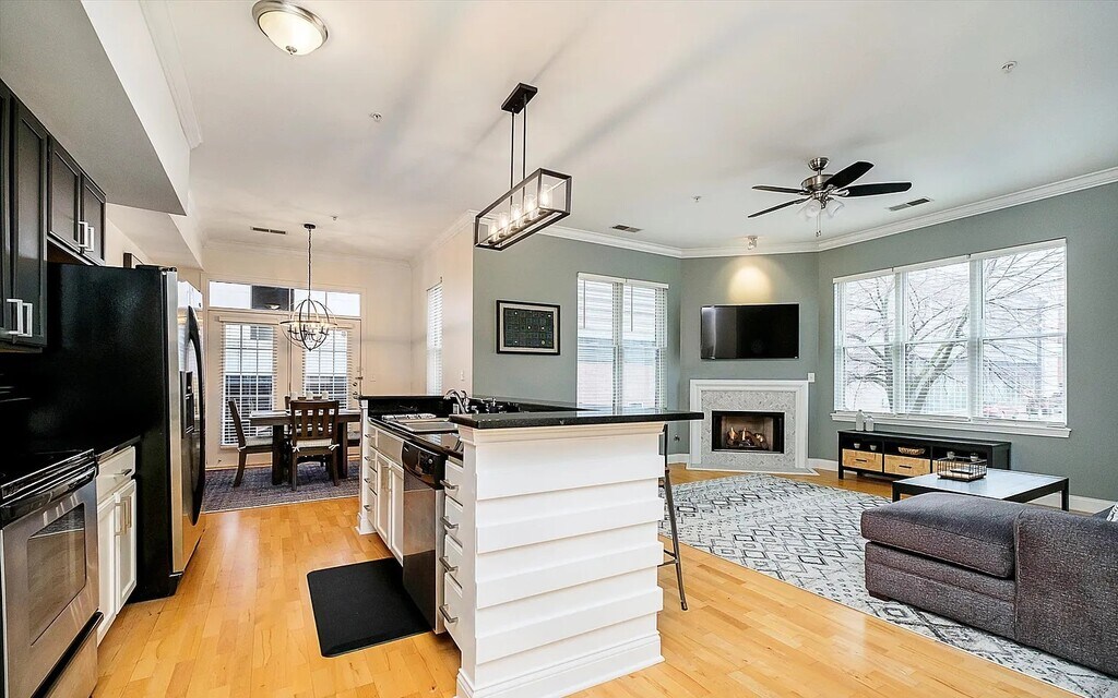 updated 1 bed, 1.5 bath, corner unit in the Hudson. Elevated main floor condo features an updated kitchen with black cabinets, black granite countertops, backsplash, S/S appliances, and island w/ bar seating for three. Kitchen opens to spacious great room with updated gas log fireplace, large windows for plenty of natural light, and crown molding. Dining area features a decorative wall and opens to covered balcony. Master suite has been renovated with tile floors, new vanity, tiled shower and separate jetted tub. Laminate hardwood floors and 10' ceilings throughout unit. Washer/Dryer in unit
