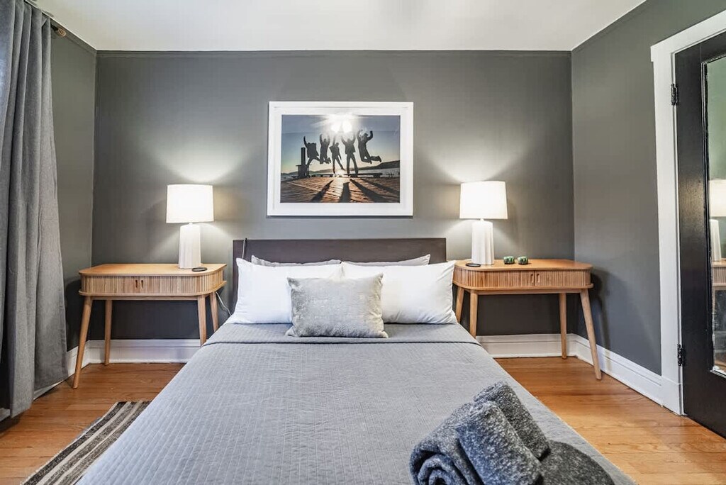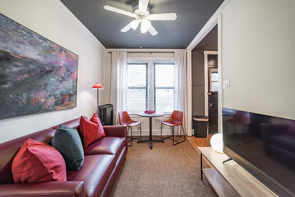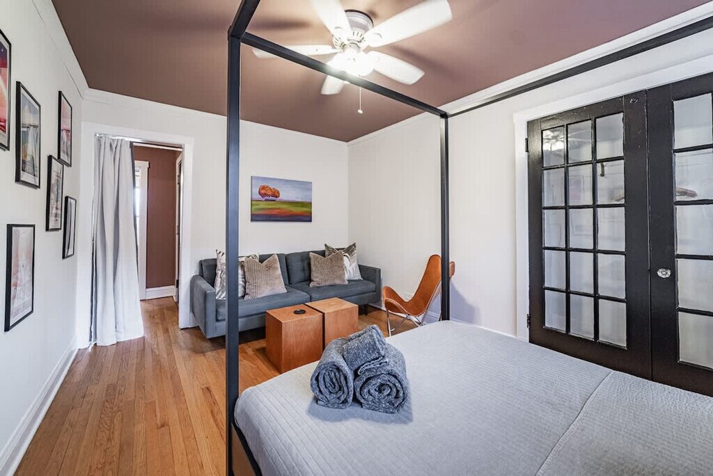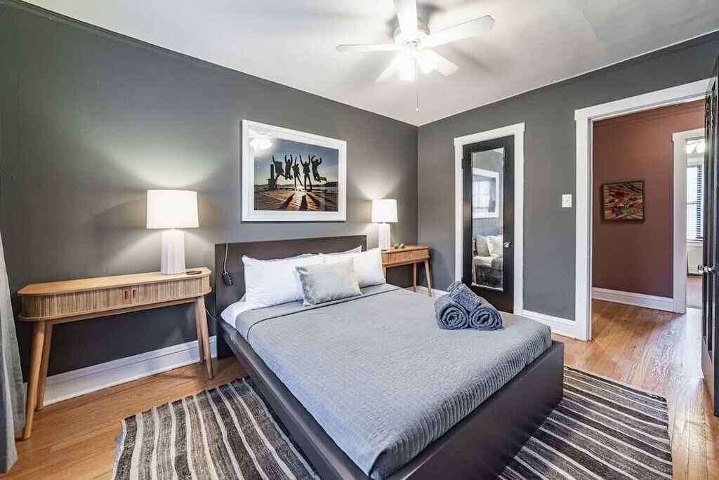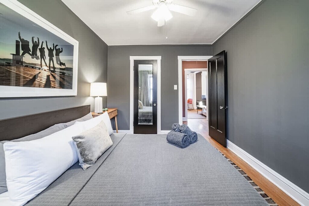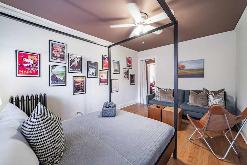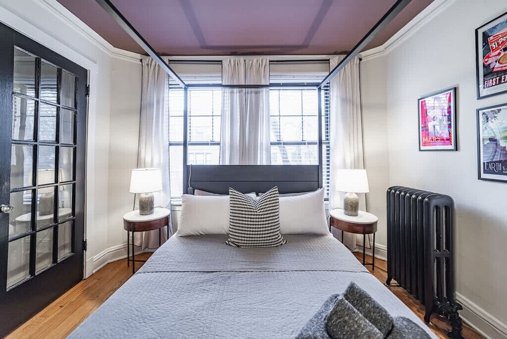 Feel at home in this unique flat on the third floor of a vintage walk-up building, so you will need to climb stairs. Its location can't be beat, with easy access to many attractions. This unique flat includes all the comforts of home while embracing the quirky charm that only a vintage building can offer. High thread count cotton sheets on the bed, comfortable feather pillows, great mattresses, and thick towels are provided. The bath products are from Public Goods. Coffee and other little amenities are supplied. Parking isn't included and the streets around the flat are all either permitted (local residents only) or metered. For the easiest parking, using a service called SpotHero to reserve a spot nearby before you arrive is recommended. During your stay as a guest, you receive a free membership to The Metropolitan, a members-only club and co-working space located on the 66th and 67th floors of the Willis Tower (for reservations less than 14 days only). Shops and restaurants are only a short walk away, and the area feels peaceful and secluded. Any point of interest in Chicago can easily be reached by walking, public transit, or Uber. Wrigley Field and Wrigleyville are an 8-minute walk away, the Southport Corridor is a 1-minute walk, the Music Box Theater is a 5-minute walk, the Metro Theatre is a 10-minute walk, Boystown is a 15-minute walk or 8 minutes via public transit, the Lakefront Trail and Belmont Harbor are 12 minutes via public transit or driving, the Lincoln Park Zoo is 26 minutes via public transit or a 15-minute drive, and downtown is 25 minutes via public transit or a 20-minute drive. The Southport 'L' train stop (Brown line) is a 6-minute walk, the Addison 'L' train stop (Red/Brown lines) is a 12-minute walk, O'Hare is 50 minutes via public transit or approximately 35 minutes driving, and Midway is 65 minutes via public transit or approximately 45 minutes driving. Room 1 has a curtain instead of a door. Check-in begins at 4 p.m. on your check-in date, and check-out ends at 11 a.m. on your check-out date. There is an automatic $500 cleaning fee if there is any smoke smell inside of the unit. There is an automatic $100 late check-out charge if you're still in the property 20 minutes after check-out. There is a $45 fee if you lock yourself out or lose your key. [SI]