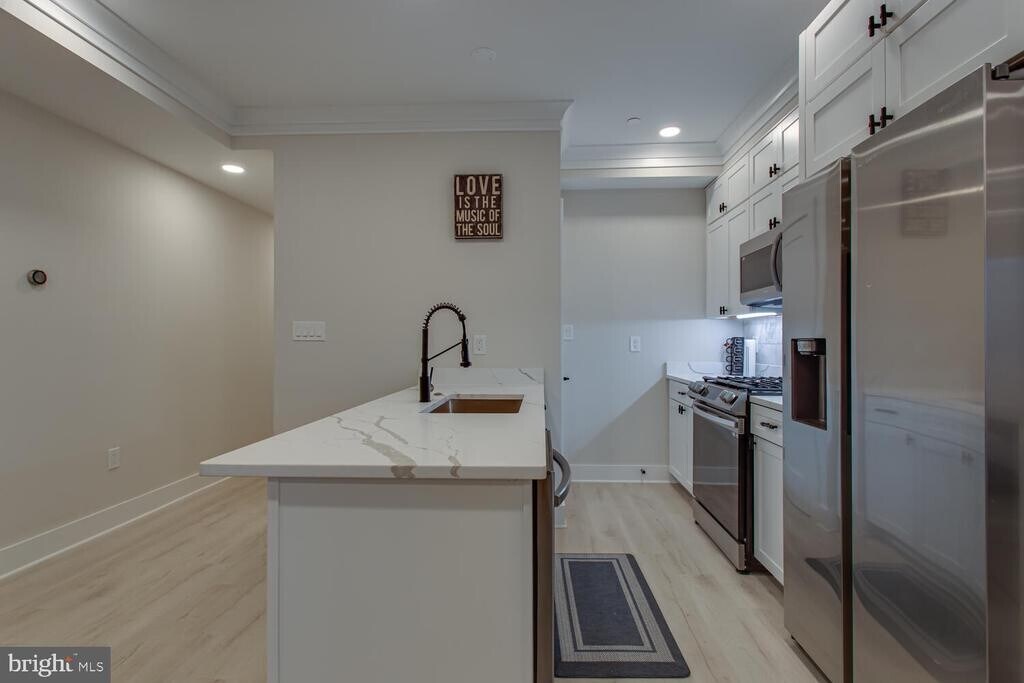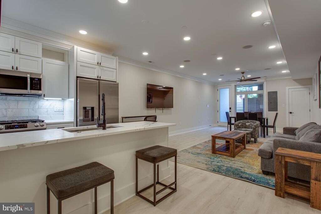 Welcome to Heights 13 – a boutique collection of three newly constructed luxury residences that live like townhomes. This lower-level Unit 1 offers a spacious 2-bedroom, 1-bath layout spanning 972 square feet, thoughtfully designed with the same elevated finishes and attention to detail found throughout the building. The open-concept living and dining area flows seamlessly into a sleek chef’s kitchen appointed with Bosch appliances, Calacatta quartz countertops, and custom cabinetry. The spa-inspired bath showcases wall-to-wall designer tile and a heated towel bar, while 9-inch wide distressed oak engineered floors add warmth and continuity throughout. Additional highlights include full-house audio, Nest thermostats, a tankless water heater, smart locks, and a Ring security system. Perfectly positioned in the heart of Columbia Heights, Heights 13 offers easy access to the vibrant 11th and 14th Street Corridors, known for their abundance of grocery stores, boutiques, and acclaimed dining. Columbia Heights and Petworth Metro stations, along with multiple Metrobus lines, are just moments away, providing effortless connectivity to downtown and beyond.. Available furnished or unfurnished.