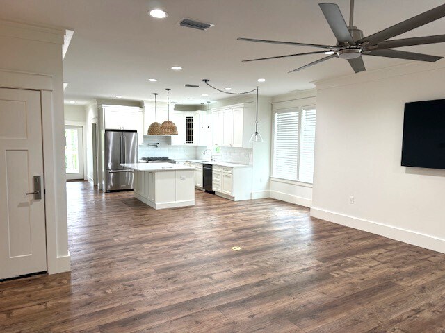 3555 Sanctuary Drive 5 BR 3 BA This is a 6-8 Month Rental In a gated community, this like-new 5-bedroom, 3-bath home, built in 2022. The main living area is located on the second floor. The gourmet kitchen features quartz countertops, a spacious island, KitchenAid appliances, gas stove, and upgraded cabinet pull-outs. Just off the kitchen is a combined pantry & laundry room with cabinets, sink, and a built-in mini fridge. The open living area flows seamlessly to a charming front deck overlooking the putting green on Hole #12 of the Bay Point Golf Course. The second level also hosts the primary suite, complete with a spa-like bathroom, oversized tile shower, double vanity, and a walk-in closet with custom cabinetry. A second bedroom and full bath are also on this level. Upstairs on the third floor, you'll find three more bedrooms, another full bath, and a massive bonus room / bunk room, playroom, fitness space, or media lounge. There's outdoor living space on the first and second level—with a front deck off the living room, a back deck with wooded views off the second level, and a ground-level back porch off the oversized garage. The garage features epoxy flooring, room for multiple vehicles, boats, golf carts, bikes, and a separate enclosed storage room, Directions: Heading South on Navy Blvd. turn left onto Magnolia Beach Rd., then turn right onto Delwood Beach Rd., turn right at the dead end, Sanctuary Beach Community entry gate will be near the end of Sanctuary Dr on the left NO SMOKING Contact Dunn Realty for Appointment Put Application in at Any person 18+ that will reside in the unit MUST submit their own application and agree to a credit and background check.