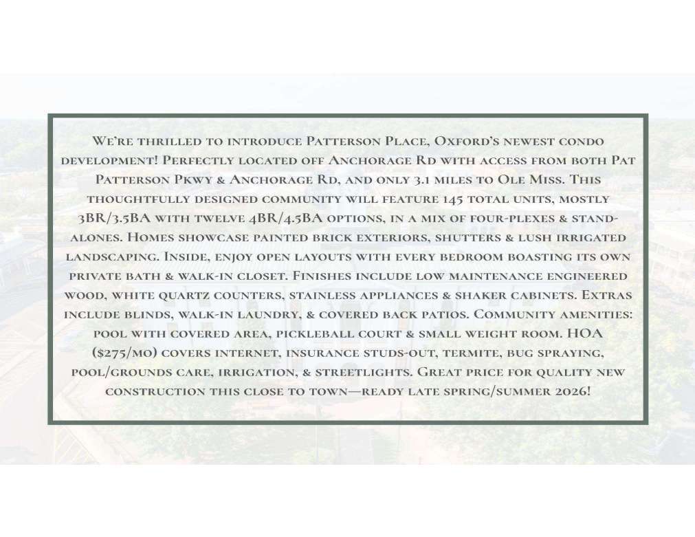 DON'T MISS OUT ON THIS! Located in Oxford's newest development, Patterson Place, this 3-bedroom, 3.5-bath home sits just off Anchorage Road, minutes from Jackson Avenue and The University. The thoughtfully designed layout provides private en-suite bathrooms and walk-in closets for each bedroom. Planned interior finishes include stainless steel appliances, quartz countertops, and vinyl hardwood-style flooring. Rent is $3,300 with a $3,300 deposit and includes internet and lawn care. Residents will enjoy access to a community pool and fitness center upon completion. $50 application fee per applicant and guarantor. All student residents are required to have a guarantor apply as well due to lack of income. Application fees are non-refundable. All tenants are required to have renter's insurance. Text or Call Meredith Killens to schedule a showing. Neighborhood Realty LLC 1100 Tyler Avenue Suite 101 Oxford, MS 38655 cell office DON'T MISS OUT ON THIS! Located in Oxford's newest development, Patterson Place, this 3-bedroom, 3.5-bath home sits just off Anchorage Road, minutes from Jackson Avenue and The University. The thoughtfully designed layout provides private en-suite bathrooms and walk-in closets for each bedroom. Planned interior finishes include stainless steel appliances, quartz countertops, and vinyl hardwood-style flooring. Rent is $3,300 with a $3,300 deposit and includes internet and lawn care. Residents will enjoy access to a community pool and fitness center upon completion. $50 application fee per applicant and guarantor. All student residents are required to have a guarantor apply as well due to lack of income. Application fees are non-refundable. All tenants are required to have renter's insurance. Text or Call Meredith Killens to schedule a showing. Neighborhood Realty LLC 1100 Tyler Avenue Suite 101 Oxford, MS 38655 cell office