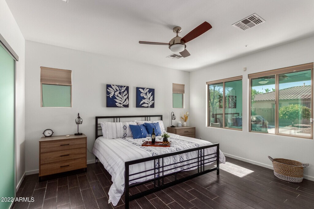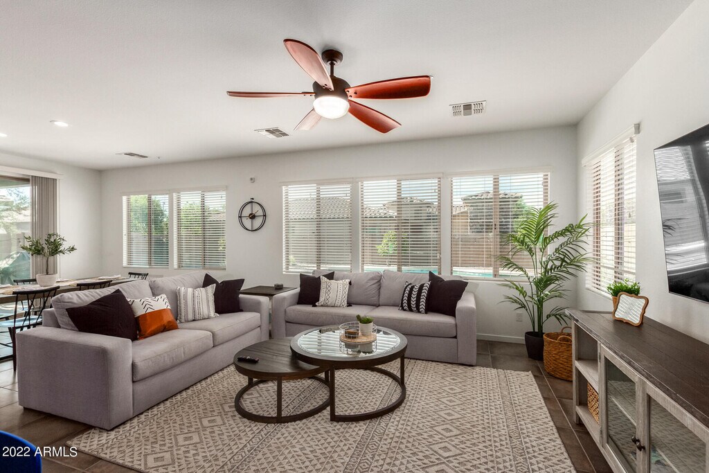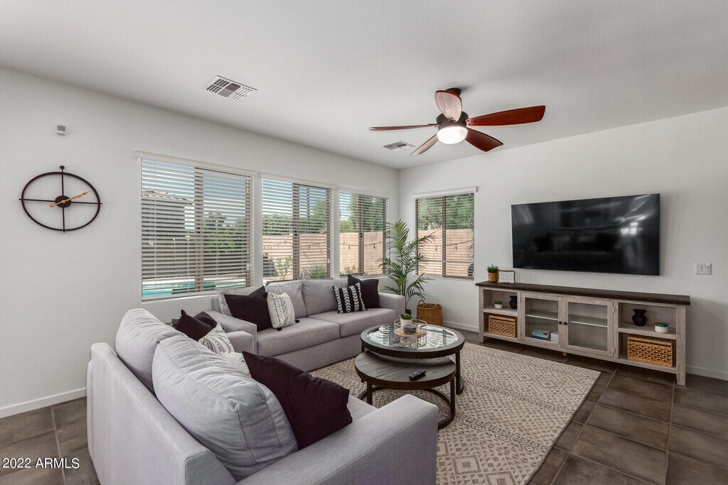 Superb modern home! You will be amazed by how perfect this house has been fully updated and how new it feels. This is the spot to stay a while. Relocation,between homes,escapes are just some reasons this home will fit almost any need. Step inside an expansive entry way with 2 queen bedrooms,a special living/lounge game area equipped with a TV between them,an additional sofa sleeper plus a full bathroom featuring double sinks. This special space closes off to create extra sleeping too on the queen sofa sleeper. Further into the home it opens into a super sized great room featuring the kitchen,dining and living room. The kitchen is fully stocked top to bottom. Everything you can imagine is available for you to create meals,snacks or to prepare for a BBQ. The dining room seats 6 comfortably and the comfy sofas are perfect for everyone including family and friends to catch a game or have a movie night. Working from home? This home has a dedicated desk space in the great room too. The popular split floor plan has a primary suite on the other side of the home with a luxurious king bed,spa bath with a walk in shower and built in walk in closet. A large TV and bright windows looking onto the designer backyard make this a lovely retreat each night. Outside you will find a sparkling heated pool with 4 sun loungers and a dining/coffee table for 4. You will live outside,as this private backyard space provides everything you are looking for. The home has super fast wifi,a 2 car garage,is on a corner lot and has a full sized inside laundry room too. Every detail has been thought through,so you are sure to make plenty of memories. SPLASH! Heated Pool and/or Spa Fee is automatically included for the duration of your reservation from October - April annually at $65 per night. Spa heat is included at $0 cost May-September and the pool will not need to be heated. Seville Today's vacation renter is looking for more than just a rental,they are looking for a home away from home. At Seville,we know that our guests are looking for a lifestyle and community. That is why Seville has been master planned to include a variety of community and lifestyle amenities. Whether you are a leisurely stroller or a dedicated runner,the meandering walking paths found throughout Seville are easily accessible for everyone to enjoy and experience the beauty of this master planned community. The community's network of walking paths and trails connect residents to parks,which feature many amenities and usable space for resident and community use. Shaded ramada's host picnic tables and barbecue grills for small or large events. Tot lots are a great place for the kids to play. Nestled beneath shade trees,benches line the perimeter of the playgrounds,providing a beautiful place to supervise children at play. Little ones will enjoy hours of play on one of our four tot lots,scattered throughout the Seville community. The parks' expanses of grassy,open areas are perfect for playing catch or soccer. Whether you are having a picnic or playing frisbee,the parks are a wonderful place for neighbors to get together and enjoy our pleasant Arizona weather in a great community. The Seville Country Club is a membership club and offers short and long term memberships should you wish purchase one.