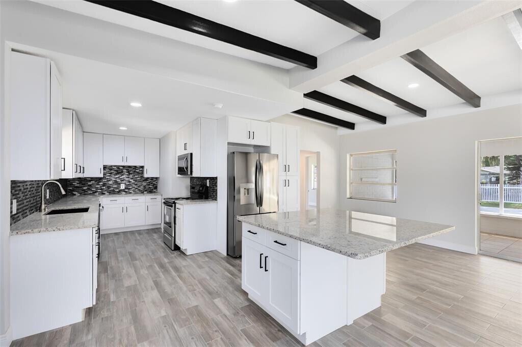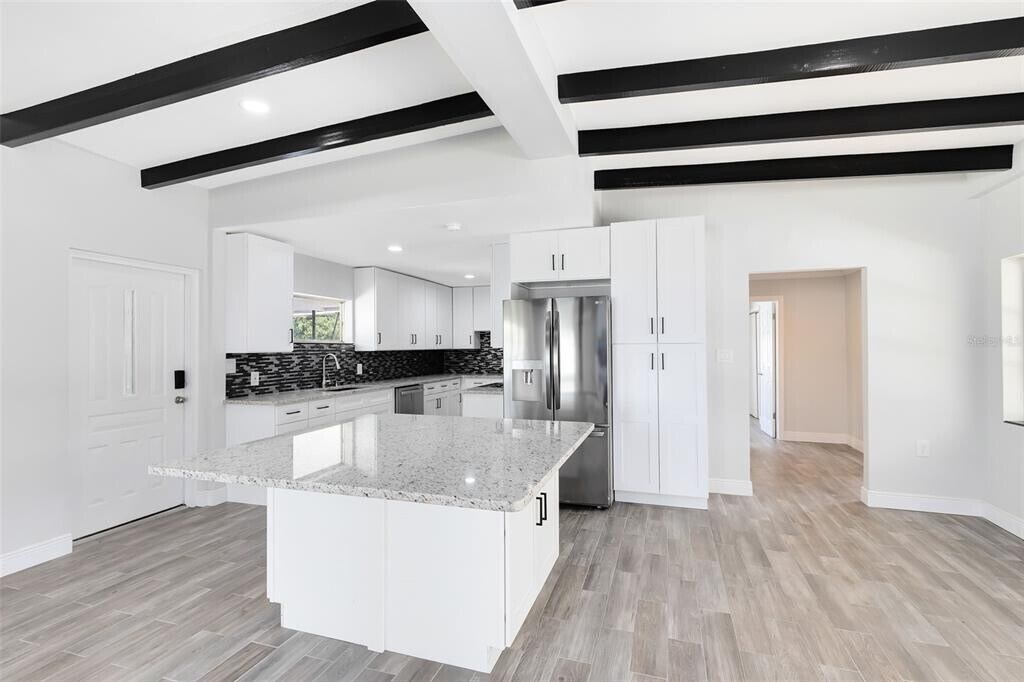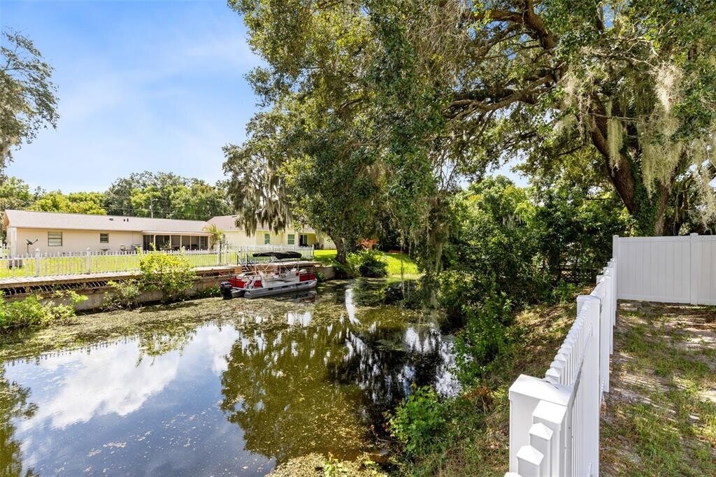 Wonderful Waterfront Home on Lake Eustis on a quiet dead end cul-de-sac street! Perfect for boating and fishing,this property features 100 feet of backyard water access located directly on a wide canal leading to Lake Eustis. Lake Eustis is an almost 7,000 Acre spring fed lake and is a central part of the Harris Chain of Lakes. Bring your Boat or Jet Skis as there is a 23’ by 13’ Boat Slip with a private gate stairwell entrance in the backyard. A short boat ride can take you to the downtown areas of Mount Dora,Eustis and Tavares for dining and entertainment. The house has been fully remodeled and features an Open Floor Plan including a total of 3 Bedrooms and 2 Bathrooms along with a separate laundry room. The home has beautifully exposed Original Ceiling Beams located in the large great room and in the bedrooms. The 3rd Bedroom is located adjacent to the house and could also be used for a bonus private office. The fully updated home includes: Brand New Gorgeous Porcelain Tile Floors,Brand New Bright Shaker Cabinets,Brand New Granite Countertops along with a Large Central Kitchen Island,Brand New Stainless Steel Appliances and Brand New Washer and Dryer,Brand New Bathroom Shower Tile with Mosaic Band,Brand New Bathroom Vanities and Toilets,Brand New Crown Molding and Base Boards,Brand New Ceiling Fans and Light Fixtures,Brand New Interior and Exterior Paint,Brand New Roof,Soffit and Gutters,Brand New Mini Split Air Conditioning System,Brand New Water Well System,Brand New Septic System and Brand New Tankless Water Heater! Walking from the covered screened in Florida Room onto the huge concrete patio,will lead you directly to the firepit and water with multiple sitting areas along the way. This allows you to entertain family and friends while also enjoying the nature,wildlife and water views. The backyard is fully gated with a newly installed privacy fence around the entire backyard of the property. There is a 12’ double gate on the left side and a 6’ gate on the right side of the property. A bonus 12x10 large shed with a metal roof and electric outlet inside is located on the back right of the property for extra storage. This property features a large horseshoe driveway and extra bonus parking space for trailers. MLS# O6379405