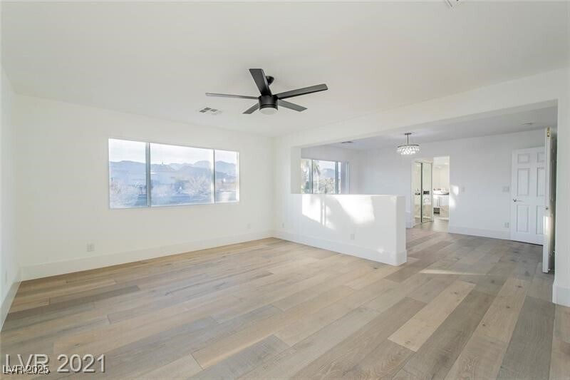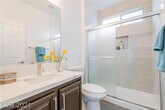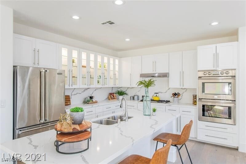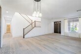 Stunning Summerlin five bedroom plus a loft with a sparkling pool! Upgrades galore! Spacious floorplan with gorgeous wood plank flooring throughout. Bedroom with a full bathroom downstairs. Updated kitchen features custom cabinets with lighting, quartz backsplash and countertops, large island with seating, stainless steel appliances, double ovens. Open living room with accent walls, a fireplace, and a built-in entertainment center. Incredible primary suite with a sitting area. Resort style ensuite bathroom features his and hers vanities, custom shower, and a large jetted tub. Updated light features throughout. Amazing yard complete with a pool and spa. A truly one of a kind gem in the heart of Summerlin! Listed rent includes $170/ month for pool service. Tenant places water, gas, electric, and trash.