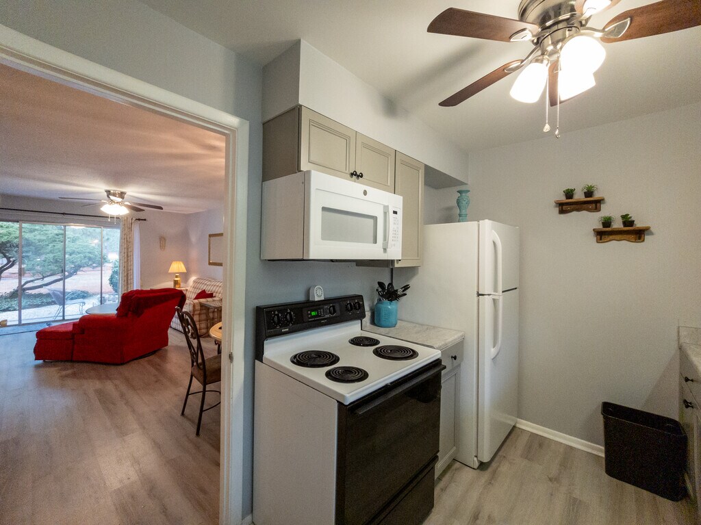Must be at least 25 years of age to lease. With FREE water, FREE sewer, FREE internet, FREE electricity, FREE trash and FREE cable TV service (a $275 value!), this renovated 2 bedroom / 1 full bath condo comes fully equipped and FULLY FURNISHED. Situated on the ground floor for easy access, your next home features NEW luxury vinyl plank flooring, NEW wall and trim paint, NEW ceiling fans, NEW lighting and NEW kitchen cabinets and countertops. Featuring a washer and dryer in the unit and a sliding glass back door leading to the peaceful back patio, enjoy access to 9 golf courses within a 3 minute drive and 3 grocery stores within a 5 minute drive.