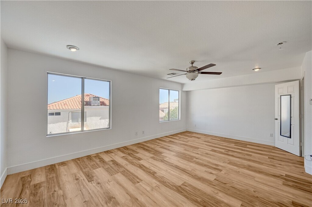 A beautiful 4-bedroom, 3-bathroom split-level home offering 2,221 sq ft of comfortable living space in a quiet, desirable neighborhood with no HOA. This well-maintained property features a flexible floor plan with one bedroom and full bath downstairs, ideal for guests or multi-generational living. The formal living room boasts vaulted ceilings and a cozy fireplace, flowing into a formal dining area perfect for entertaining. The heart of the home is the open-concept kitchen with granite countertops, a center island, and a view into the step-down family room, which includes a second fireplace. Upstairs, the spacious primary suite offers a walk-in closet and ensuite bath with separate tub and shower. Two additional bedrooms upstairs share a full bath. Enjoy the Las Vegas sunshine in the private backyard featuring a sparkling in-ground pool and spa, along with a deck area perfect for outdoor dining or lounging.