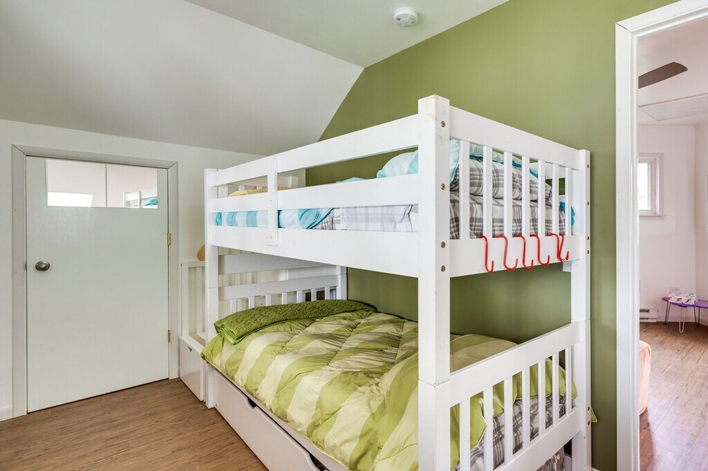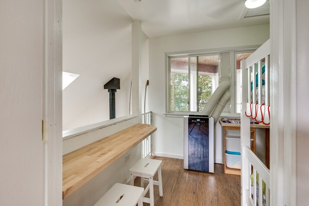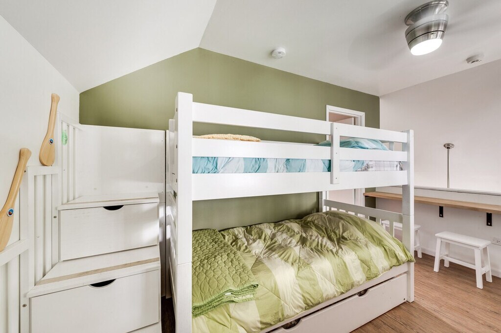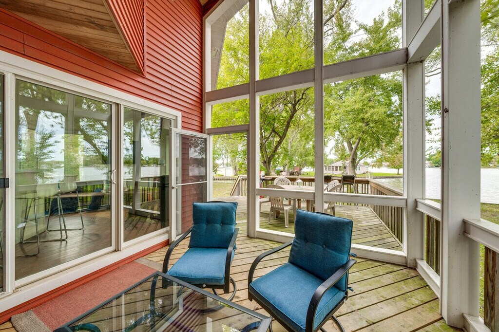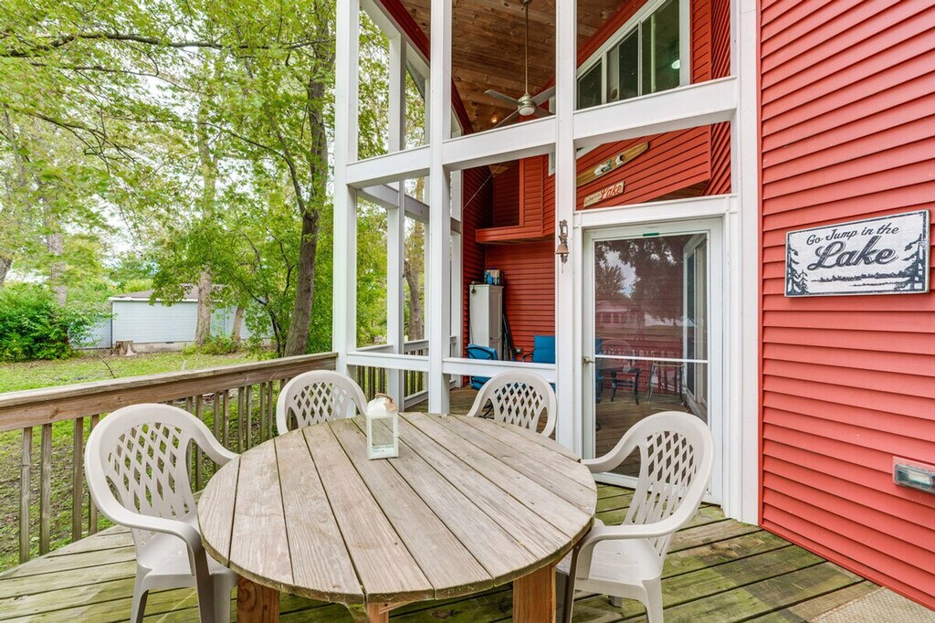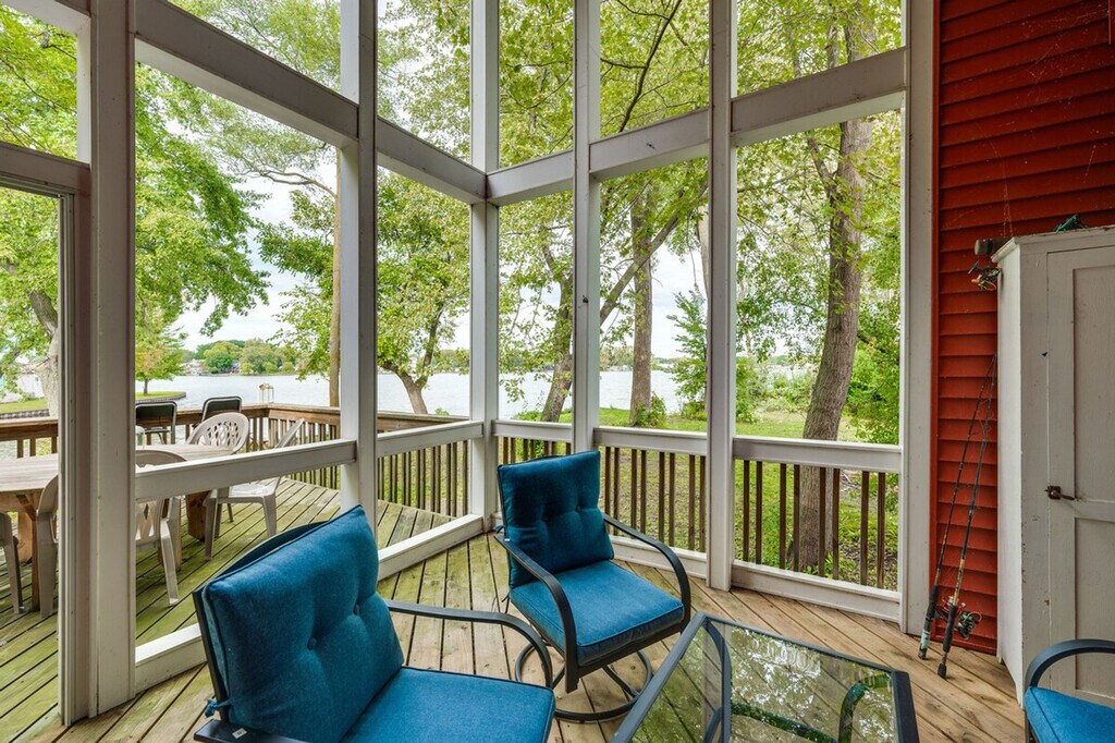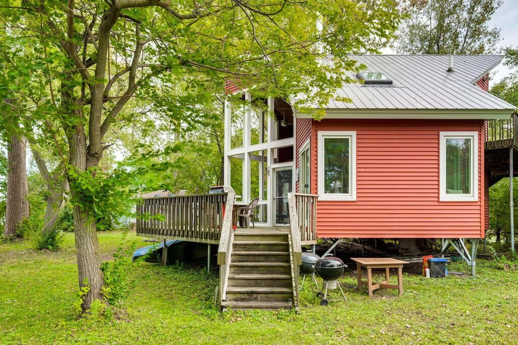 Feel at home in this unique 2-bedroom, 1-bath cabin on Fox Lake, accessible only by boat. This 2-story cabin requires exterior stairs to enter, and an interior ladder is required to access the bedroom and loft on the 2nd floor. This cabin boasts a wood-burning stove, a flat-screen TV, and an island with seating. The kitchen is equipped with a refrigerator, stove/oven, dishwasher, microwave, Keurig coffee maker, toaster, cooking basics, spices, dishware and flatware, a water filter, trash bags, and paper towels. Enjoy free Wi-Fi, electric heating, and 2 electric A/C units in bedroom 1 and the loft. Linens, towels, complimentary toiletries, and a hair dryer are provided, as well as a washer and dryer. Pet are welcome with a fee of $100, plus fees and taxes. Parking is available in a marina lot for 1 vehicle. Located on a private island, this cabin offers secluded surroundings and easy access to aquatic activities. Spend your days exploring the Chain O'Lakes, relaxing on the porch, or visiting Six Flags Great America. This is a non-smoking property, and no events, parties, or large gatherings are allowed. Guests will have access to the entire property. This property is only accessible by boat, and a low-powered boat is provided for use during your stay. A waiver may be required prior to using the boat. The boat requires 1 step to enter. A photo ID may be required upon check-in. Additional fees and taxes may apply. [SI]