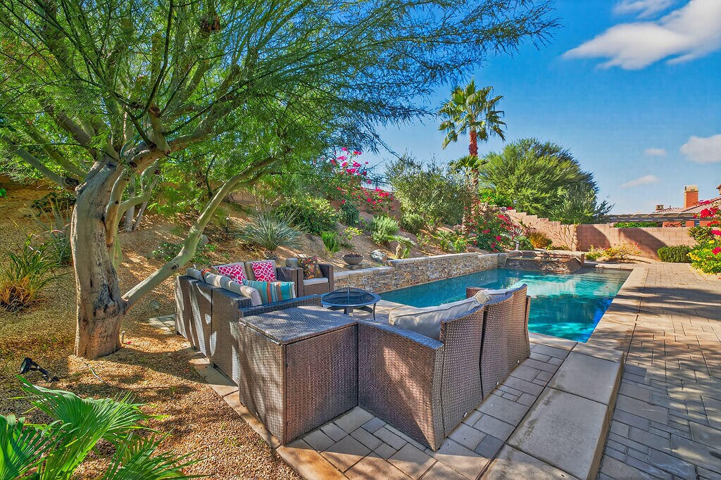 Sunshine meets effortless desert living in this turnkey-furnished home within the gated community of The Gallery. Offering 4 bedrooms,3.5 baths,and 2,754 SF of open,beautifully designed living space blending comfort,style,and seamless indoor-outdoor flow. Step into the spacious great room with a cozy fireplace and adjacent formal dining area,perfect for intimate gatherings. The chef's kitchen offers stainless steel appliances,a large center island,and a sunny breakfast nook,for effortless entertaining. The open layout extends to a south-facing backyard drenched in all-day sunshine,where a sparkling pool and tranquil waterfall create the perfect retreat for relaxation or hosting beneath the desert sky. The primary suite features patio access,dual sinks,a soaking tub,and a walk-in closet. Three additional guest bedrooms,including one with an ensuite bathroom,provide exceptional comfort and privacy,while a bonus room off the kitchen adds flexibility for an office,fitness room,or creative space. Located close to world-class golf,top-rated restaurants,shopping,the Indian Wells Tennis Garden home of BNP Paribas Open,and Empire Polo Grounds for Coachella and Stagecoach,this modern desert paradise is ideally situated for both leisure and adventure. Rate varies by month; annual $5,000/month,Jan-March $7,000,April $14,000,May-Oct $4,500,Nov $6,500,Dec $7,000.