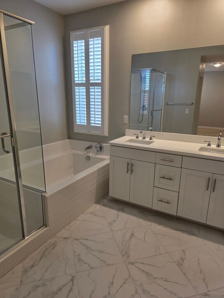 Beautiful 4 bedroom, 2.5 bathroom home within the gated Vista Bella community! Two story spacious floor plan with 1685 sq.ft. featuring plank flooring downstairs, neutral paint, vinyl plantation shutters, modern fixtures, abundant natural light, and an open-concept kitchen and living room. The beautiful kitchen includes white cabinets, granite countertops, stainless steel appliances including refrigerator, large pantry, island and built-in desk. The large primary bedroom features dual sinks, soaking tub and a generously sized walk-in closet. Convenient upstairs laundry room includes washer and dryer. Low maintenance backyard with vinyl fencing for added privacy. Two car attached garage with additional storage space and 3rd car parking space. Includes energy saving solar panels, water softener, tankless water heater and Quiet Cool whole house fan. Conveniently located near top-rated schools, parks, shopping, dining, entertainment, and freeway. This is a non-smoking home. Must have minimium 650 credit score to qualify. Don't miss this opportunity!