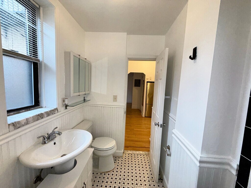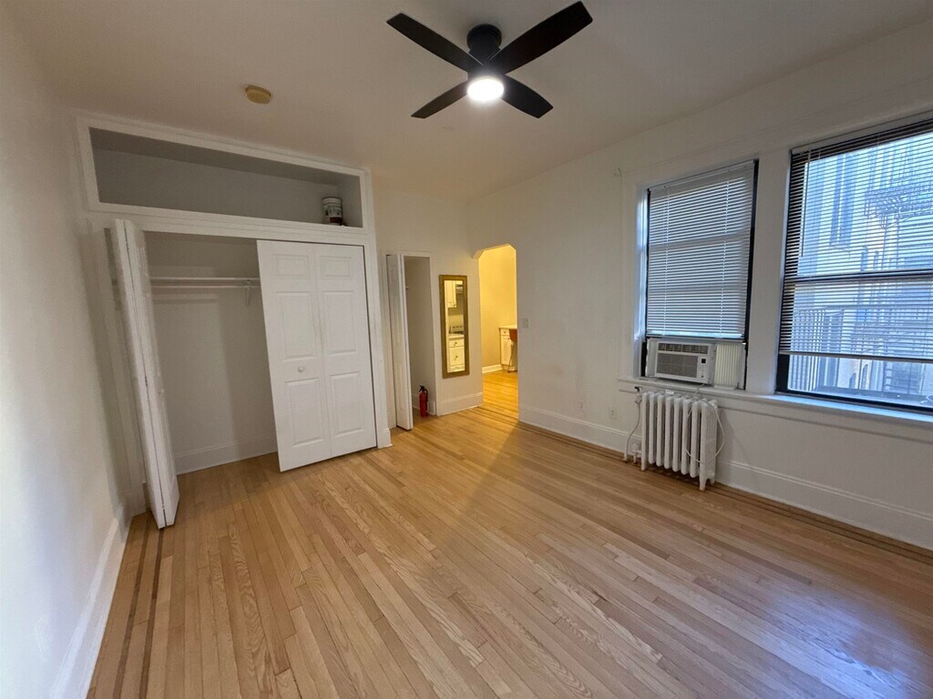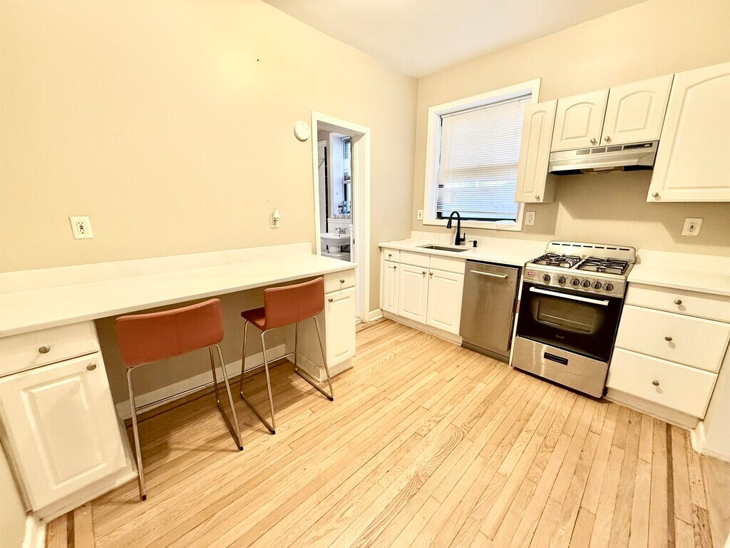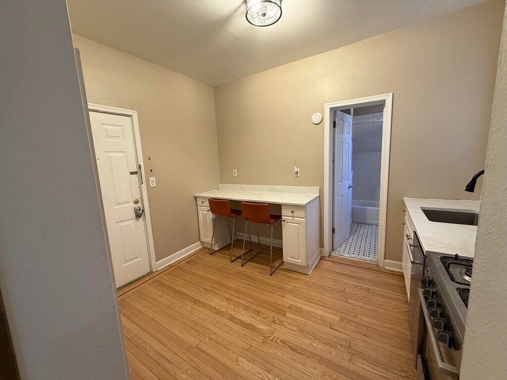 Beautifully updated studio apartment with modern finishes and fixtures throughout. Features a separate kitchen area with a breakfast bar, elegant hardwood floors, a spacious bedroom with wall-to-wall closets, and a full bathroom. Conveniently located close to parks, shopping, and transportation (bus and PATH) - a commuter's dream.