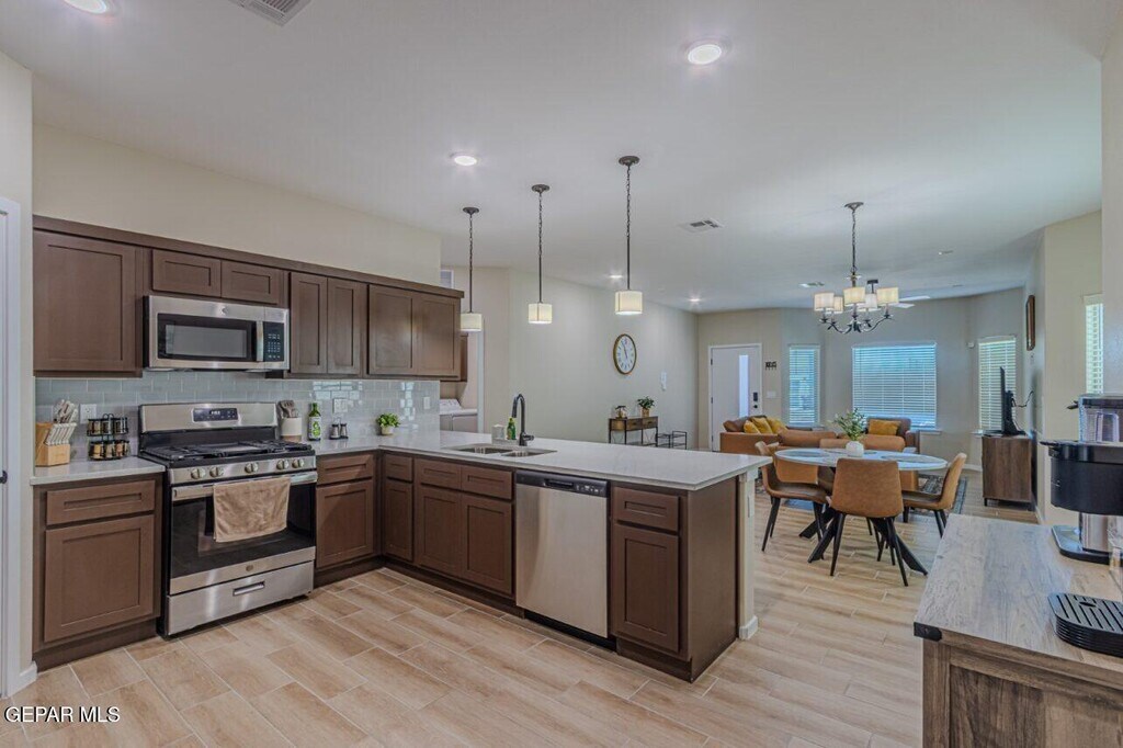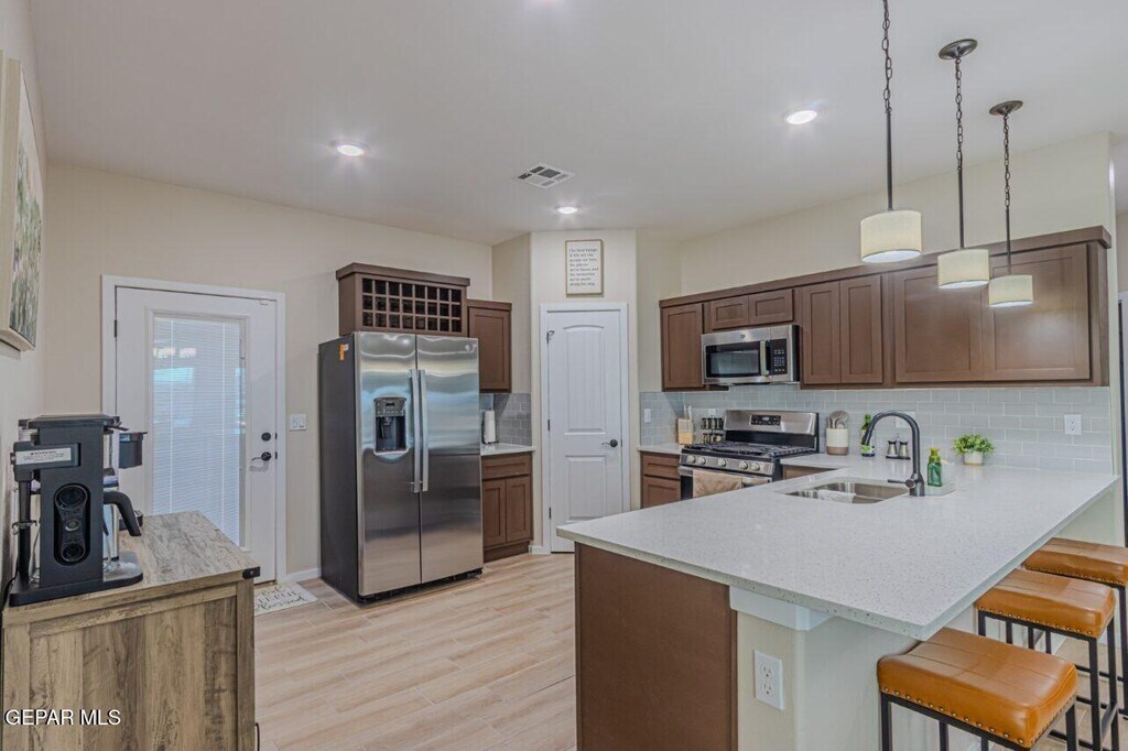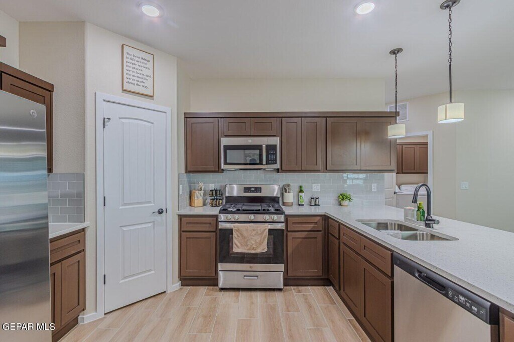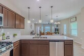 Step into this stylish and functional Transitional-style home featuring an open layout and plenty of natural light. The kitchen is a chef's dream with granite countertops,a sleek tiled backsplash,and stainless steel appliances (no fridge). Maple wood cabinetry adds warmth and charm,while the spacious breakfast bar offers extra seating — perfect for casual meals or entertaining. Enjoy easy-to-maintain tile flooring throughout the main living areas and cozy carpet in all four bedrooms. The primary suite features a walk-in closet and private bath,while the three additional bedrooms provide plenty of space for family or guests. The backyard is fully landscaped,offering a relaxing space to unwind or host weekend gatherings,and the home sits just steps away from a nearby park — ideal for morning walks or playtime outdoors. A separate laundry room and convenient access to the double garage add to the home's thoughtful design. Sorry,no pets allowed.