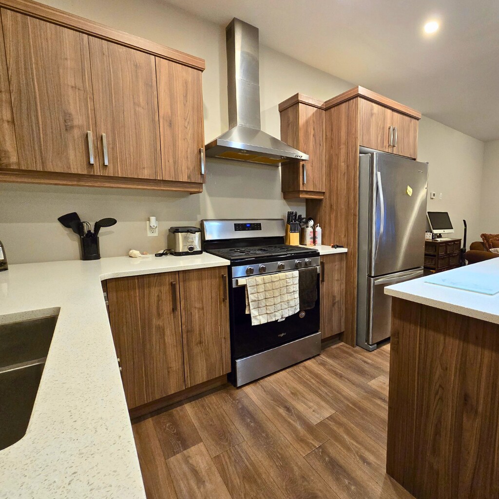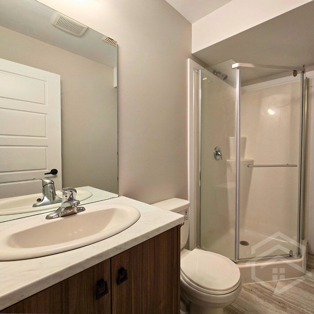 Modern 3-Bedroom Townhouse!! The main floor boasts an open-concept design with 9-foot ceilings, featuring a modern kitchen equipped with quartz countertops, stainless steel appliances, and an island perfect for meal preparation and casual dining. The adjoining living area opens to a fenced backyard, providing a private outdoor space for relaxation or entertaining guests. Upstairs, the primary suite offers dual closets and a luxurious 4-piece ensuite, while two additional bedrooms share a well-appointed bathroom. With second-floor laundry facilities and a finished basement that can serve as a home office, recreation room, or additional living space. Residents will appreciate the proximity to local amenities, including shops, restaurants, and parks, as well as easy access to major highways for commuting.