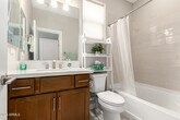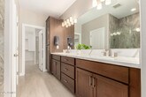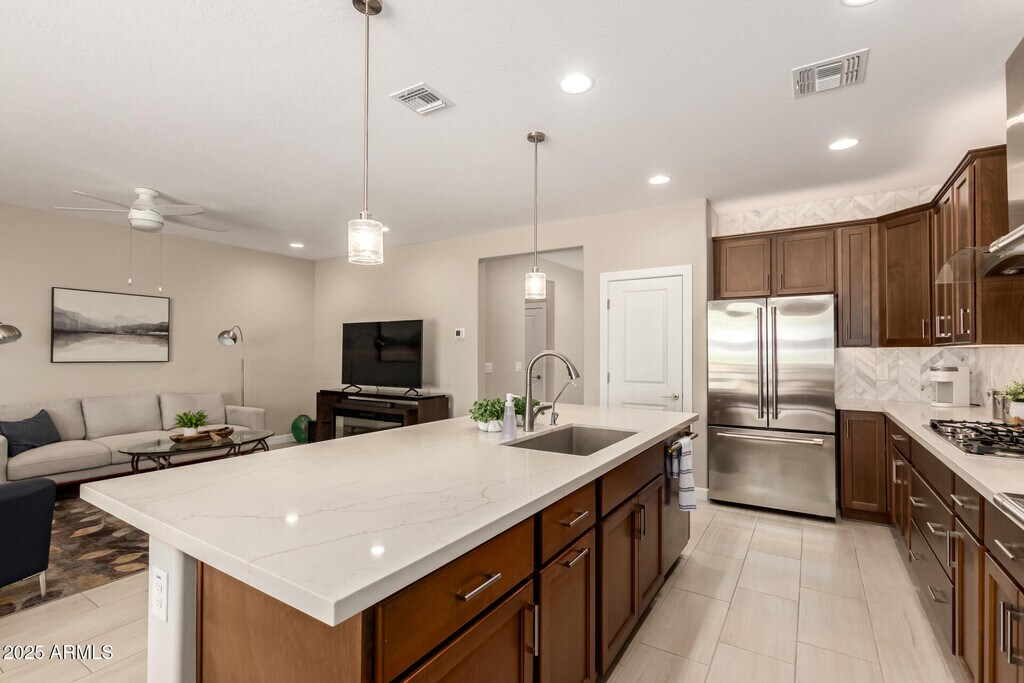 The moment you pull into the exquisite Encanterra comm. you'll know you're home. This stunning home offers 2 bd,2.5 ba,plus a spacious den perfect for a home office or guest space. The kitchen is truly a chef's dream,featuring quartz countertops,upgraded backsplash that extends to the ceiling,stainless steel appliances,a gas cooktop,and an oversized island ideal for entertaining. The open-concept floorplan flows beautifully into the great room and out to your patio where breathtaking views await of the golf course and serene lake,and while taking in the majestic Superstition Mtn. from your patio. Prepare to be impressed!!!