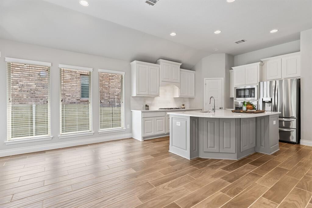 Located just inside the neighborhood of Wolf Ranch West! So close to shopping, dining, major highways for an easy commute, and major employers. This Perry Home was built in 2019 with just over 2100/sq ft, a 3 bedroom, 2 bath, 2 car garage, on a nice private lot with rock wall fence in the back yard. Modern design and light interior color palette, wood-look tile flooring throughout all main living areas, center island in the open kitchen, designated dining area, study or media room, and oversized covered patio.