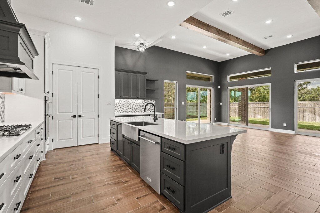 Beautiful home with many custom finishes in the gated,country club community of Weston Lakes. Impressive double iron doors welcome you,and then be wowed with the high ceilings,wood beams,and views of the back porch thought sliding glass doors. The Kitchen includes high-end KitchenAid appliances,quartz counters,designer backsplash,oversized range hood and pot filler. Owner's ensuite with freestanding tub and 2-person walk-in shower with independent temp valves. Laundry is centrally located and features a pet shower and direct access to the primary closet. Call today to see this wonderful home. MLS# 32610696