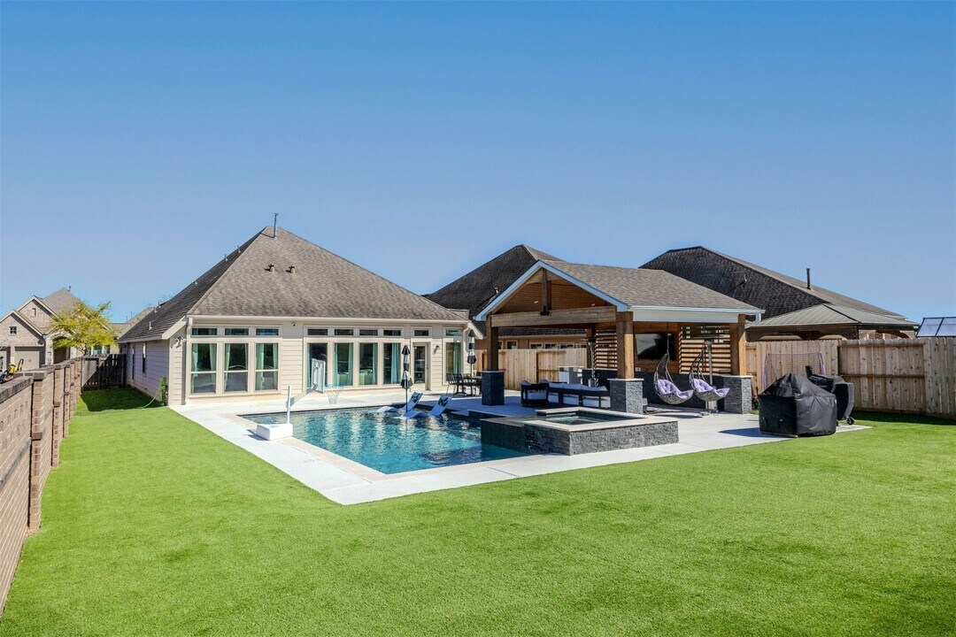 Welcome to this beautiful Perry Homes four bedroom,two in a half bath lease with a private backyard retreat. A wide entry and tall ceilings create a bright and welcoming first impression. Two secondary bedrooms and a full bathroom are located near the front of the home,ideal for guests or family. The entry opens to a versatile flex space that can be used as a dining room,game room,or additional living area. The open concept living room,kitchen,and dining area offer plenty of space for entertaining. The spacious primary suite accommodates large furniture and features a bathroom with separate tub and shower plus a large walk in closet with custom built-ins. Step outside to enjoy a covered patio,low maintenance turf lawn,and private pool; pool maintenance is included. Convenient access to Highway 288 and close proximity to Pearland Town Center for shopping and eating. MLS# 11787480