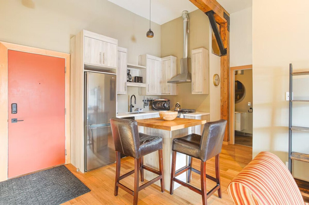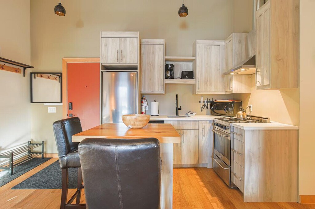 The advertised rate of C$3,039/month is the lowest available price, based on a 1 month(s) stay with a move-in date of September 28, 2026. Rates vary depending on the duration of stay, season, and other parameters. For exact pricing and additional pricing components, please visit our website and enter your desired move-in and move-out dates. The rate is applicable when billed upfront; it can be higher if billed in multiple payments. Feel at home in this fully renovated, modern, air-conditioned suite with exposed brick walls, located at the top of the high street in a charming mountain town. This suite is accessible via two flights of stairs. This cozy downtown suite features an open-plan living space, a fully equipped kitchen with apartment-sized appliances and small appliances, and a comfortable lounge area with plenty of seating, a large smart TV, and a gas stove. The kitchen also includes a supply of salt, pepper, cooking oil, and fresh coffee beans. The bathroom has a large walk-in shower with hotel-quality towels and locally made hand soap and body wash/shampoo. Behind a dividing wall is a welcoming queen bed with side tables and a wardrobe. The window has blackout blinds. There is a communal laundry room available for use during your stay. There is the option to have mid-stay cleans with laundry change during your stay, which includes the top-up of basic amenities. Once you have used all the basic amenities in the unit (dish soap, toilet paper, etc), you can reach out and purchase a replacement basket, or feel free to purchase your own from town. Just steps from restaurants, cafés, and local shops, this suite offers convenient parking right outside. Since this unit is in Downtown, expect some local noise throughout the day and into the evenings. If you have any kind of allergy please reach out to us prior to booking. Registration Number: Provincial registration number: PM156853418 [SI]