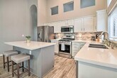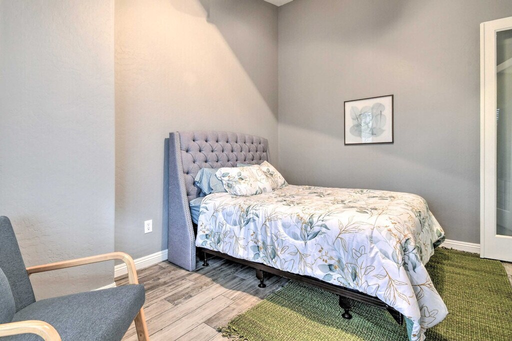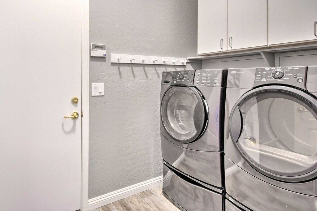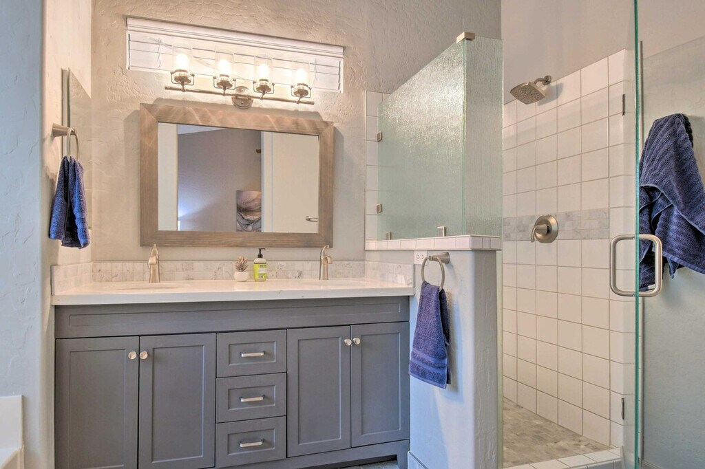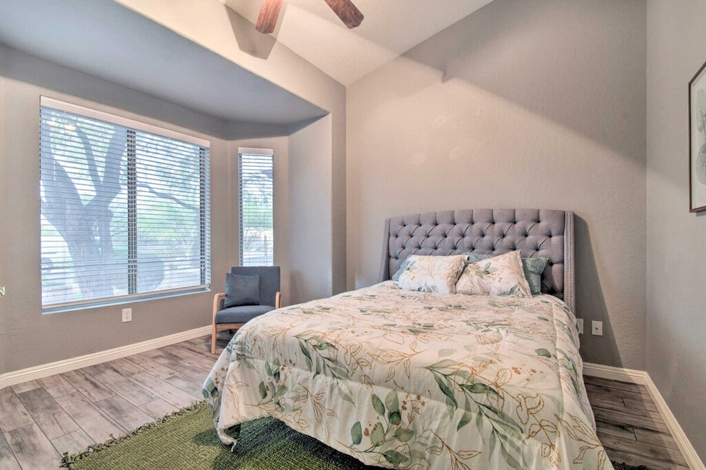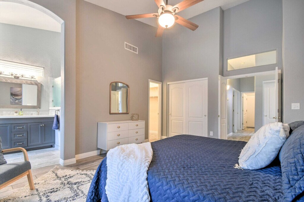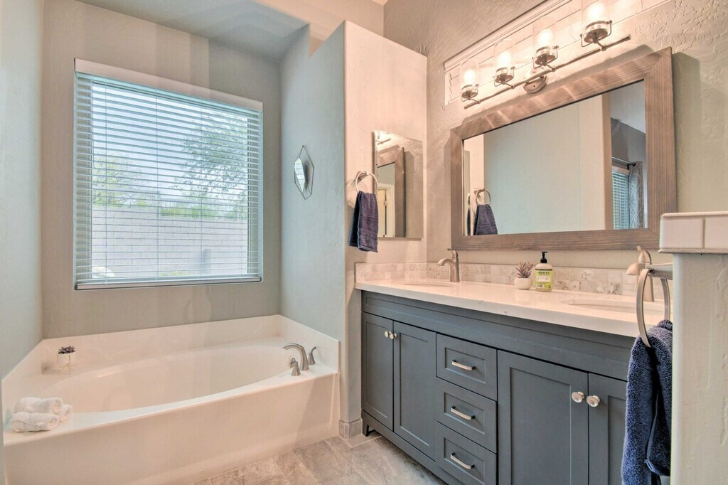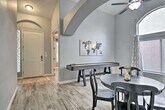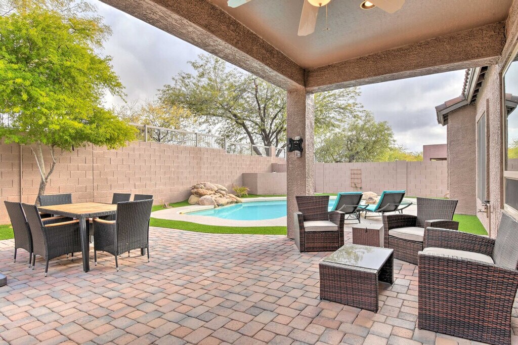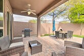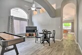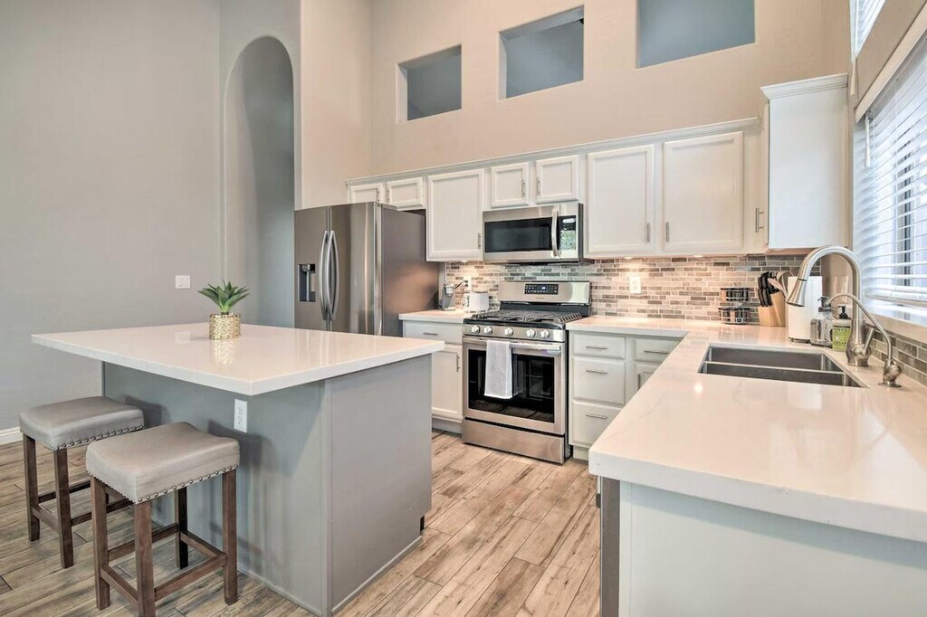 Welcome to this 4-bedroom, 2-bath vacation rental in Arizona, where you'll feel at home. This 1,756 square foot home offers step-free access. This home features stainless steel appliances, a breakfast bar, and a modern interior. Enjoy community amenities, smart TVs, a tabletop shuffleboard, a patio, a dining area, and a fire pit. The kitchen is equipped with a stove, oven, microwave, refrigerator, dishwasher, dining table, coffee maker, spices, and toaster. Other amenities include free Wi-Fi, central air conditioning, ceiling fans, a hair dryer, hangers, an ice maker, linens, towels, trash bags, paper towels, a walk-in closet, and a water filter. A washer and dryer and a gas grill are also available for your convenience. There is an optional nightly pool heat fee of $20, plus fees and taxes, applied to the entire stay. Garage parking for two vehicles and driveway parking for two vehicles are available. Hop in a car to check out trails, shops, and hot spots. Community amenities include two pools with jacuzzis, parks, a soccer field, a spa, a fitness center, a tennis court, a bocce ball court, a pickleball court, a basketball court, a splash pad, a golf club, and hiking trail access. Guests must abide by all HOA rules and guidelines. Commercial vehicles with logo decals must be parked inside the garage overnight. No overnight street parking is allowed. No smoking, pets, events, parties, or large gatherings are permitted. Guests must be at least 25 years old to book. [SI]