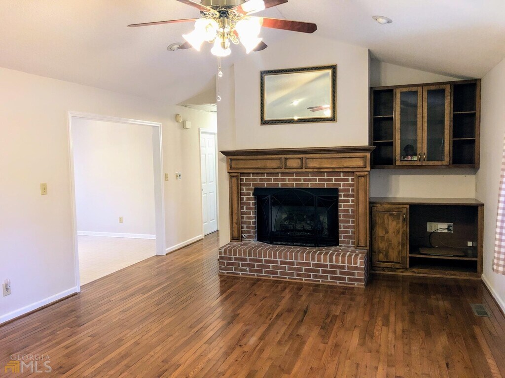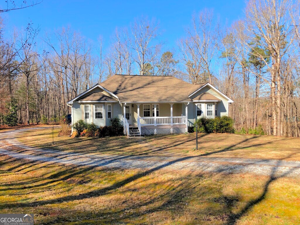 AVAILABLE MARCH 2026! 3 bedroom / two bath ranch on an unfinished basement. Enjoy the outdoors, and explore the 7 acres property down to Fry Branch Creek. The appealing front porch has plenty of room for seating for the whole family and affords privacy as the house is set back from the main road. Lovely wood floors, brick hearth gas log fireplace and built-ins in the spacious living room. Large laundry room off the kitchen has extra cabinets and built in ironing board. Walk in pantry, and breakfast bar in kitchen. Master bedroom features a bay window, walk -in closet and private bath with jetted tub and double vanity. Split bedroom plan puts the two secondary bedrooms, one with bay window, on the opposite side of the house with a shared hall bath. Full unfinished basement for tons of storage! Boat / equipment garage door at rear of house. Woodsville Elementary.