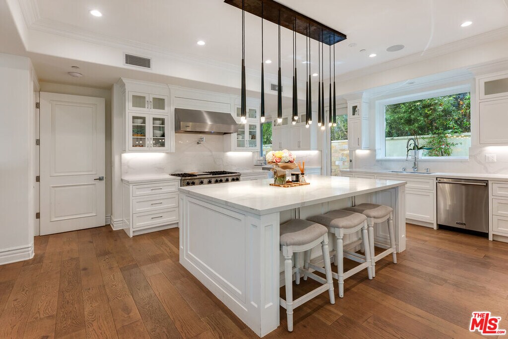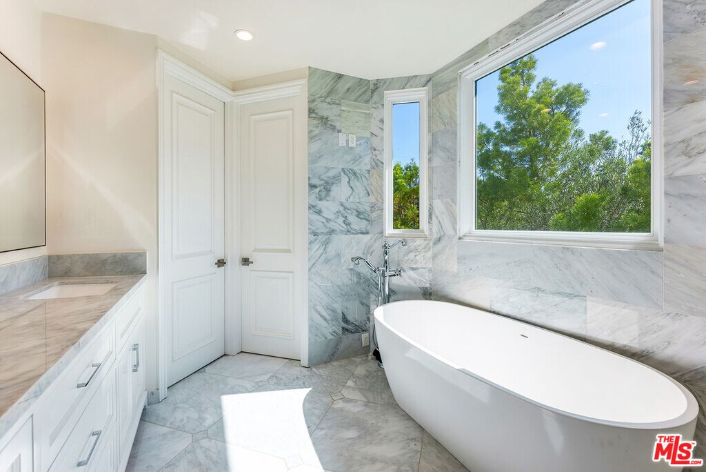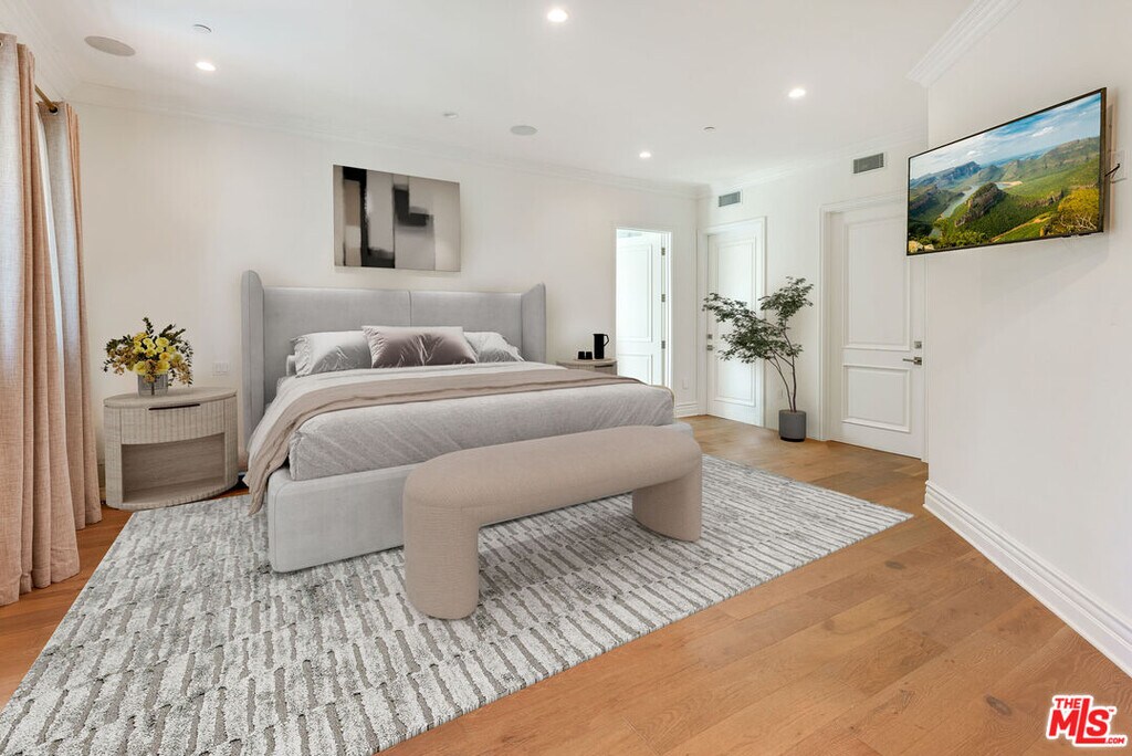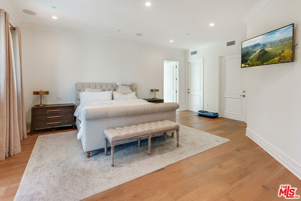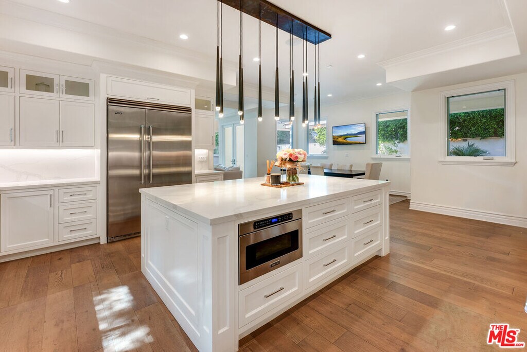 Newer beautiful Mediterranean with over 7000 sf is a fabulous family home. High ceilings, open spaces flow - formal living room, dining room with French doors outside. Hugh kitchen with center island and additional chef's kitchen open to family room, and outside entertaining areas with built-in barbecue and studio. Guest room and office on main level. Upstairs are 4 en-suite bedrooms, large primary with dual closets and fabulous bath. Rooftop deck with area currently being used as a gym. Lower level has a staff bedroom, fabulous movie theater with stadium recliner seating and a huge open space for play or entertaining. Easy beautiful living and walking distance to all the shops, and cafes that the heart of Brentwood offers. MLS# 25631253