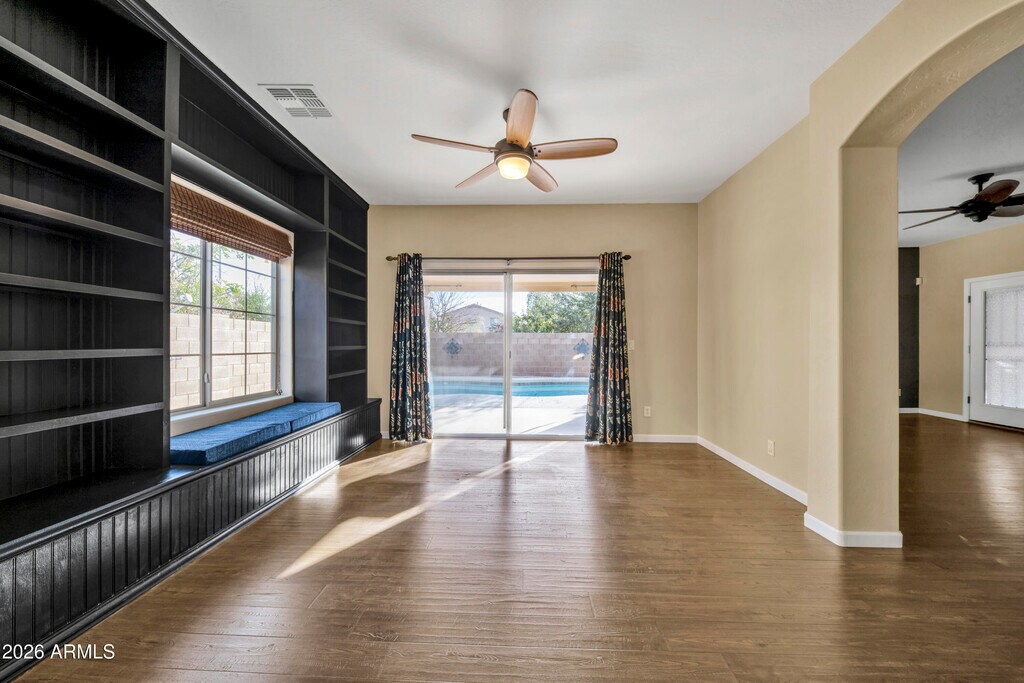 Step into this breathtaking two-story home featuring a formal living room and a dining room with custom built-in shelving. The eat-in gourmet kitchen boasts granite countertops,a gas stove,and a farmhouse-style pantry with a barn door and abundant storage. The main level includes a downstairs bedroom,a spacious laundry room with access to the extended garage. Ascend the dramatic staircase to find a generous loft,three additional bedrooms,and a dedicated office. All bathrooms are equipped with automatic timer light switches. The backyard features a sparkling pool and two covered patios perfect for BBQs and gatherings.
