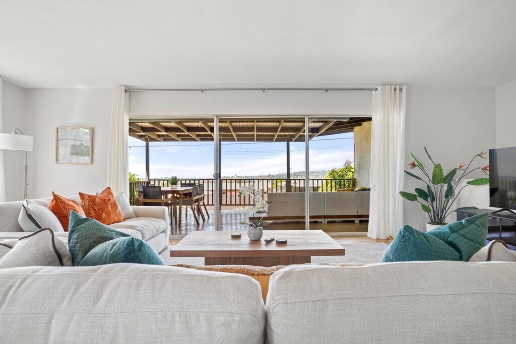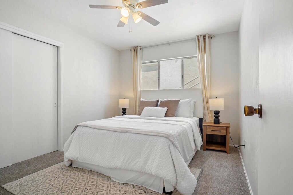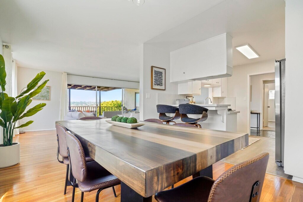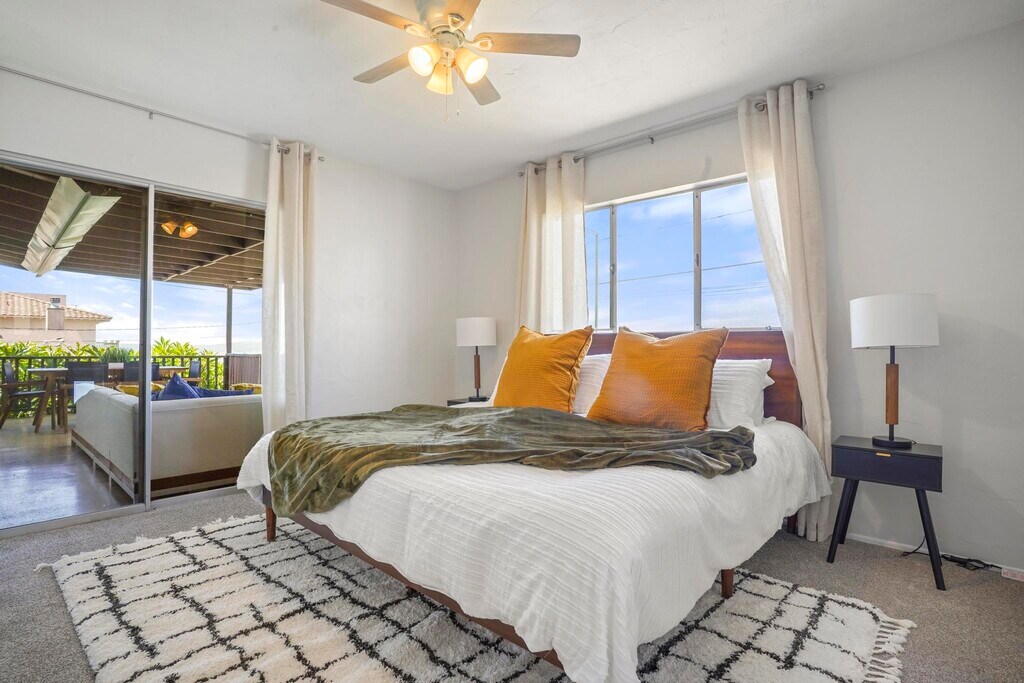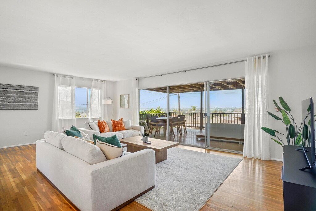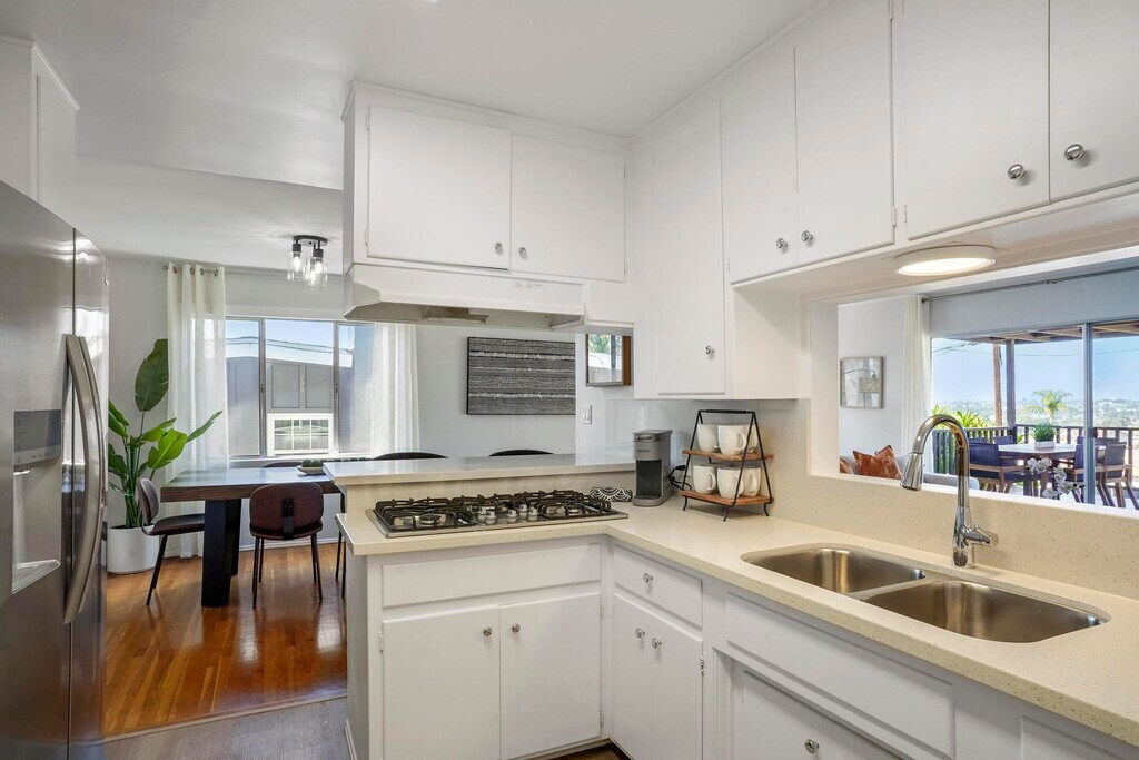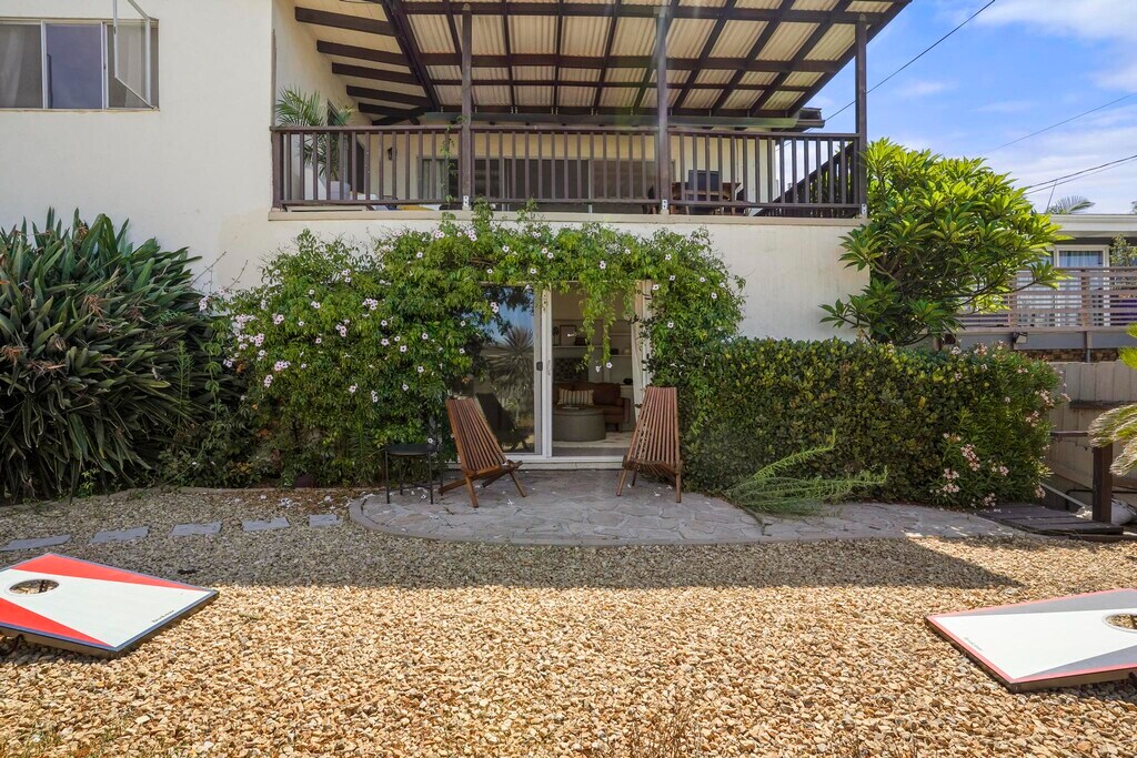 Three bedrooms, the kitchen, dining area, living room, and 2 bathrooms are located on the main level: First room - 2 twin beds Second room - Queen bed Third room (master) - King bed with an attached bathroom The kitchen is fully stocked and opens up to a large dining table and bright & spacious living room. There is a smart TV in the living room, a gorgeous patio deck with outdoor seating and dining, complete with fire pit. Downstairs in the den you'll find another queen sized bed, a separate living space, half bath, kitchenette and tons on games for the family to play. The backyard has a couple chairs and Cornhole! There's free parking in the back of the home, as well as the driveway, and unregulated street parking. In the garage there is a washer and dryer for your use. Welcome to fabulous San Diego! This incredible home is located in the desirable neighborhood of Bay Park, which is the most central spot in town. All new furnishings bring this ultrachic space to life. Picture yourself soaking in the views of a famous Southern California sunset while you enjoy a glass of wine on the deck... Lounging on the super comfortable outdoor sofa and feeling the warmth of the brand new fire pit... you'll never want this vacation to end!