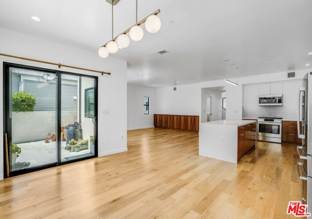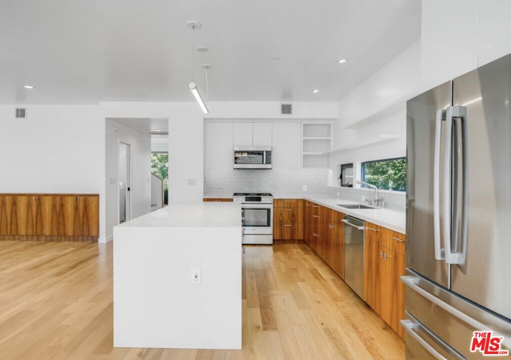 Located in Mar Vista's desirable Wood Streets, this newer construction home offers modern design, flexible living spaces, and a thoughtfully planned layout ideal for today's lifestyle. Farmhouse-inspired architecture and a landscaped front yard create strong curb appeal, while a long driveway leads to a detached two-car garage at the rear of the property. Inside, the front of the home features a light-filled living area and a separate office or bonus room with built-in shelving ideal for working from home. The hallway opens to the kitchen, finished with walnut cabinetry, wood flooring, a glass tile backsplash, Corian countertops, and Bosch appliances. Just off the kitchen is a second living space with custom built-ins, offering a natural extension for everyday living and entertaining. A spacious powder room and laundry area complete the main level. Upstairs, the primary suite is highlighted by dramatic vaulted ceilings that define the home's architectural character, along with an en-suite bathroom and walk-in closet. Two additional bedrooms, a full bathroom, and a third living space provide flexibility for guests. Additional features include recessed lighting, dual-zone HVAC, updated electrical, and copper plumbing. Conveniently located near top-rated schools, popular restaurants, and neighborhood shops, this home has it all. Available for lease. Reach out to schedule a private showing. MLS# 26637003