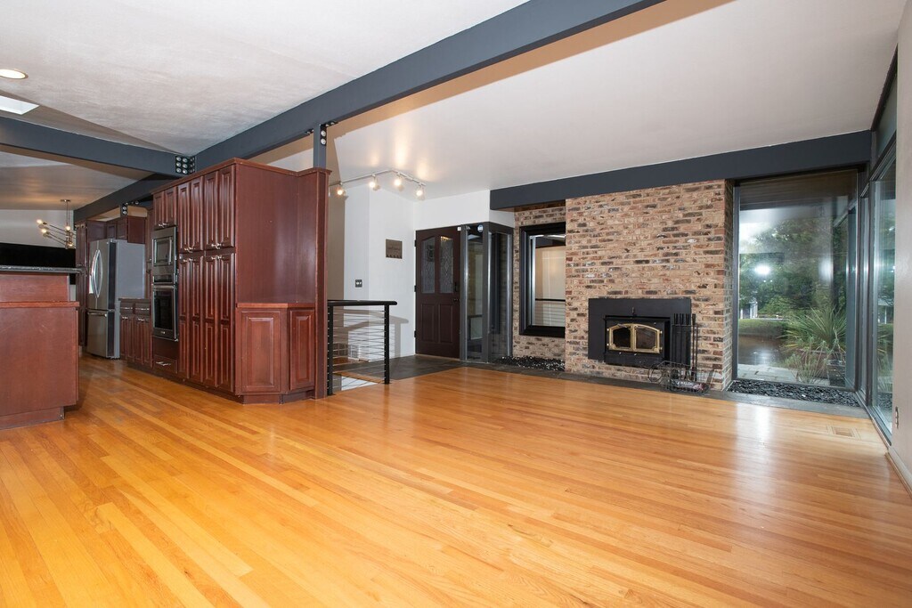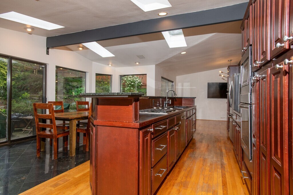 Granite gourmet kitchen opens to eating space with heated granite floor, skylites,windows,and a slider to the backyard. Cherry cabinets,oak flr, granite bar & cutting area, gas cooktop. 3BR and 2 baths on main level plus formal dining rm and living rm w/fireplace. Master bth has unique jetted soaker tub. Downstairs den/family rm w/fireplace and tile floor, large laundry/utility rm plus office/rec rm and convenient 2 car garage with shop space. One-half block from Discovery Park.