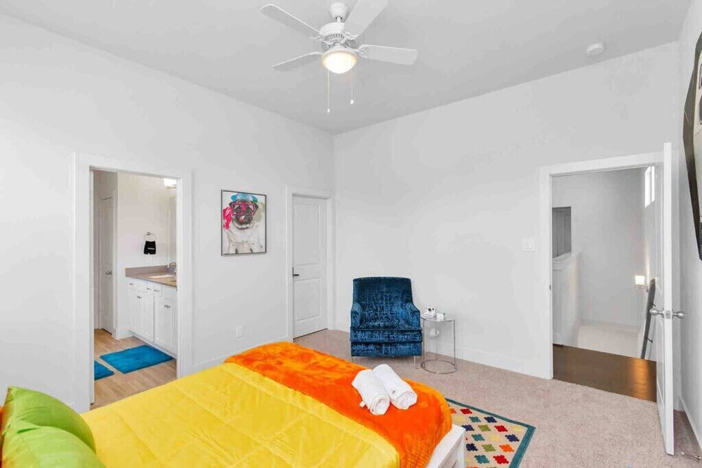 Feel at home in this stylish, newly built townhouse centrally located in Houston. This gem features unique themed rooms with vibrant colors and high ceilings. This home features a fully stocked kitchen with pots, pans, and cooking utensils, central AC and heat, and an in-unit washer and dryer. Complimentary toiletries are provided for your convenience. Smart technology allows for easy check-ins. Each guest is guaranteed a private attached garage spacious enough for two economy vehicles. Additional free parking is available along surrounding streets, but not in front of the home. Early Bird check-in (if available) is $100 for 12pm and $75 for 2pm. Late checkout at 12pm (if available) is $75. Located in the heart of the Greater Third Ward area, this home is only 10-15 minutes from Houston’s well-known establishments. It's minutes from Houston’s most notorious attractions, including both airports, tasty restaurants, Downtown, Galleria, Medical Center, George R. Brown Convention Center, Houston's Zoo, nightlife, and more. With easy access to low-cost ride shares such as Uber and Lyft, you can explore the vibrant Houston Museum District, featuring 19 museums and galleries, and discover art, history, and science at renowned locations like the Houston Museum of Natural Science and the Menil Collection. No smoking is allowed in the home or tampering with smoke detectors. A $350 fine will be assessed plus cancellation of booking without refund for any violator of this policy. Pets are not allowed at any time. Unreported pets will result in a $250 fine. Check out is at 11am, and a $75/hr fee will be automatically applied after 11am. Late check out will only be available if there are no same day check-ins. All events, gatherings, or parties must be approved prior by the host. [SI]