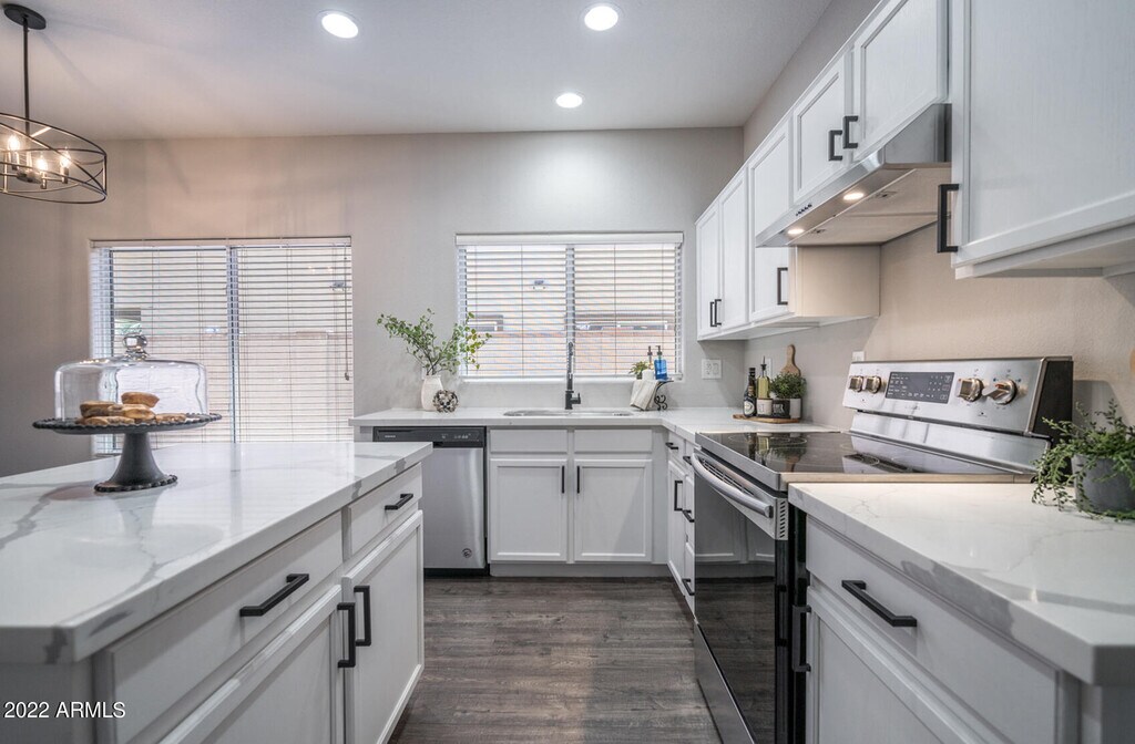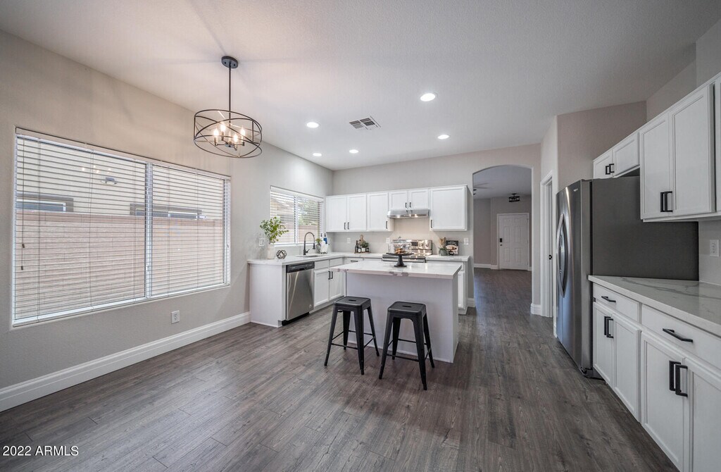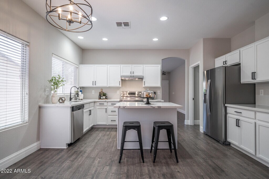 Beautifully renovated home now available in sought after location of San Tan Ranch in Gilbert! You'll be welcomed into a light and bright home with new wood look flooring and amazing baseboards throughout. Two family rooms provide options for a dedicated workspace,multiple gathering/gaming rooms,or just some extra privacy. 3 bedrooms all have ceiling fans and window treatments. Bathrooms have been renovated with new toilets,vanity,lights and bath fixtures. Like to cook? You'll love the kitchen with a separate island for additional serving space,cooking prep,or even pull up the bar stools and create an eating space. Stainless steel appliances,custom backsplash,& beautiful quartz counters complement the white cabinets and new hardware. One of the nicest rentals Gilbert has to offer.