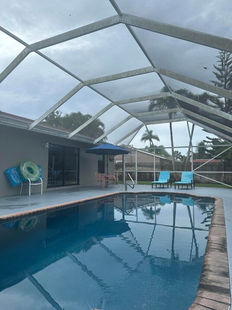 Welcome to this beautifully renovated and impeccably maintained 3-bedroom, 2-bathroom with private pool in the heart of Boynton Beach! This spacious residence boasts a remodeled kitchen with granite countertops, upgraded bathrooms, and a screened-in patio with pool--perfect for relaxing or entertaining. Large driveway - perfect for trailers, RVs, and boats! Centrally located, you'll enjoy quick access to I-95, the Turnpike, US-1, shops, dining, schools, and more. Homes for rent in this sought-after neighborhood are a rare find, so act fast--this one won't last long!Lawn & pool maintenance included.