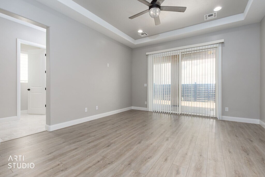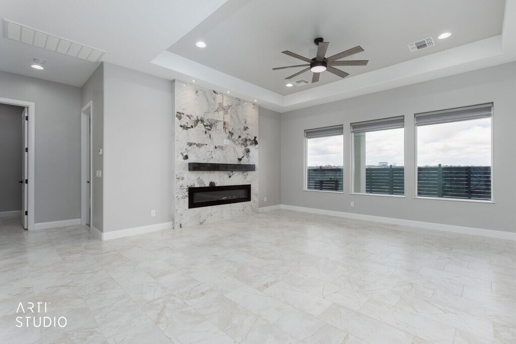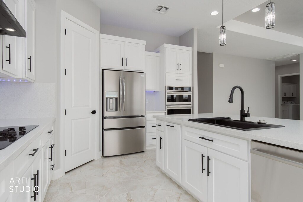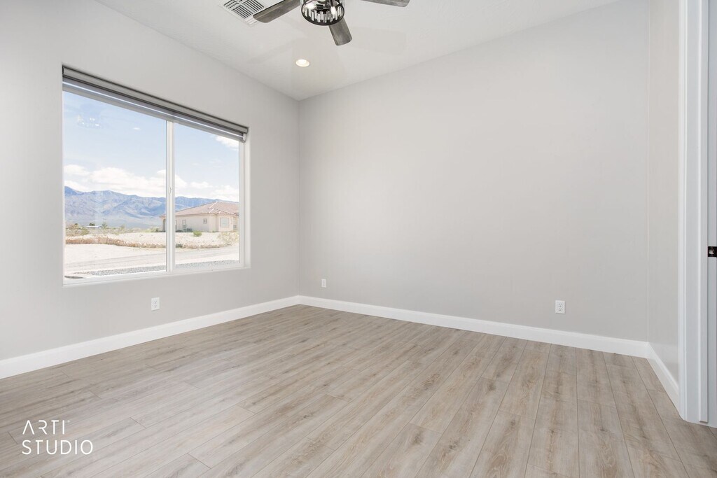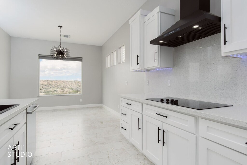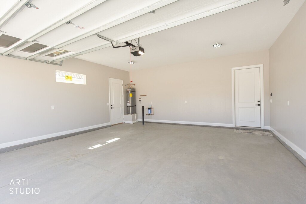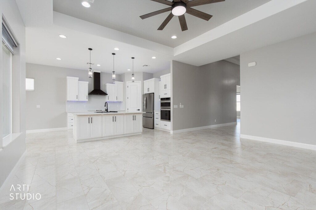 Brand-new home in Scenic, AZ, never occupied. This modern home features high ceilings, tall doors, and contemporary finishes throughout. White tile floors brighten the main living areas, complemented by brand-new stainless-steel appliances in the kitchen. A built-in electric fireplace adds a stylish focal point, with under-cabinet LED lighting enhancing task illumination. The spacious laundry room includes washer and dryer, a sink and abundant cabinetry. Both bathrooms showcase elegantly tiled showers. Additional highlights include a two-car garage and a fenced backyard with mountain views. Be the first to make this pristine home your own. Call us today at to schedule a tour or apply at Sorry no pets allowed.