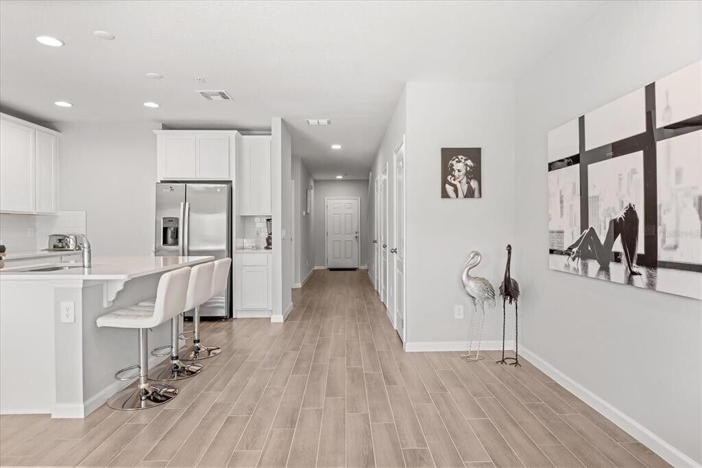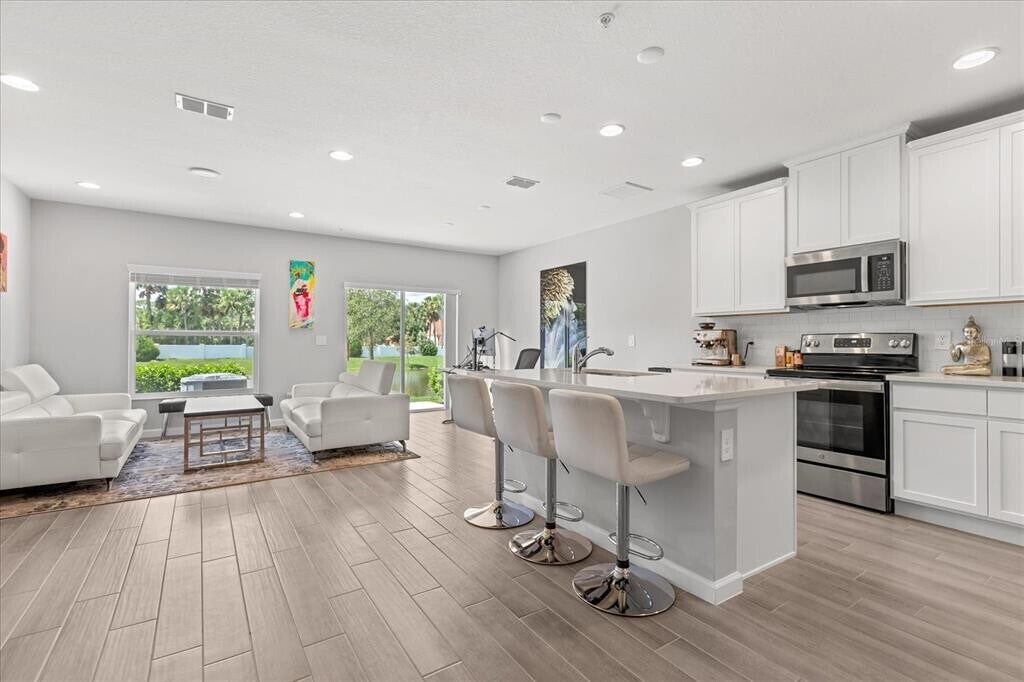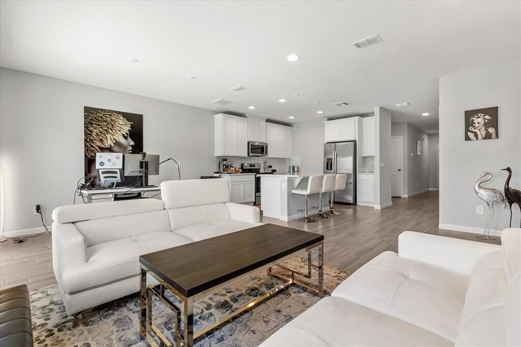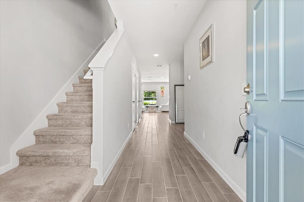Location,location,location: Welcome to this 3-bedroom,2.5-bath home with a spacious loft,nestled in the highly sought-after Towns at Lake Monroe Common,in pristine move-in-ready condition - one of the few townhomes with a backyard directly to large pond with a fountain. With a modern,minimalist style and a gated neighborhood,this home offers sophistication and convenience all in one: a spacious and open kitchen and living area,along with sunny southwest-facing windows - a beautiful kitchen featuring a spacious island with quartz countertops. Upstairs,there are three bedrooms. The primary bedroom features an en-suite bathroom and a spacious walk-in closet,a guest bathroom and a large flex room. This home features a 1-car garage with epoxy flooring and a 3-car driveway. Residents enjoy access to a lovely swimming pool and a dedicated dog park. SMART RING front door camera/voice and SMART RING garage door camera with lightning/voice - SMART Philips HUE LED bulbs in kitchen,living room & second floor - all controlled via app,giving you countless dimmable color custom options. Only steps away from Lake Monroe. With direct access to the Lake Monroe Trails and Sanford Riverwalk,you can walk/run/bike from the front door. Built by the reputable M/I Homes,this home offers a prime location near Sanford International Airport,SunRail Station,and Historic Downtown Sanford,which features a vibrant mix of boutique shops,art galleries,local breweries,and top-rated restaurants. MLS# O6355093