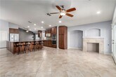 Former model home with a 3-car garage, pavered driveway, and meticulously maintained interiors. Tile floors lead to the open-concept great room, combining the living, dining, and upgraded kitchen. The front features two guest bedrooms, one with dual Murphy beds and the other with custom built-ins. The primary suite includes a walk-in closet and a spa-like bath with a tiled walk-in shower. A spacious backyard offers a covered patio, storage shed, included propane BBQ, and artificial lawn—perfect for easy maintenance and entertaining!