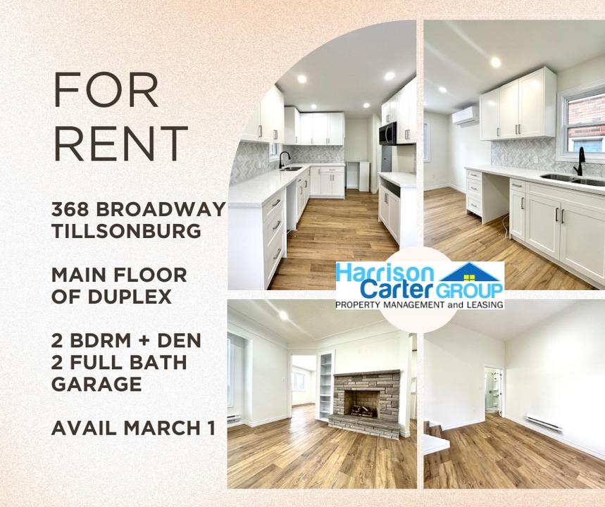 Tillsonburg ! 2 Bedroom + DEN / 2 FULL Bath * MAIN Floor UNIT * AVAIL March 1 ? Bright, Renovated Main-Floor Duplex for Rent – Tillsonburg ?Welcome home to this beautifully renovated main-floor unit, located on one of Tillsonburg’s most sought-after streets. This space is bright, open, and thoughtfully updated, offering a perfect blend of style and comfort.??? Gourmet Kitchen Highlights The stunning kitchen features stone countertops, custom backsplash, and modern appliances, flowing seamlessly into a bright dining area — ideal for hosting or everyday living.??? Spacious & Functional LayoutLarge primary bedroom with his & hers closets and abundant natural lightSecond bedroom with closetBonus den / office space near the garage — perfect for work-from-homePrivate main-floor living with separate entrance?? Parking & Outdoor SpaceOne garage bay exclusively includedParking for two vehiclesShared backyard (quiet lower unit tenant)?? Fantastic Location Close to downtown Tillsonburg, mall, shopping, banking, and bus routes — everything you need just minutes away.?? Ideal Tenant Fit Perfect for a quiet, mature professional or couple seeking a well-maintained, peaceful home.?? Rental Details• $2,250 + hydro & heat (water included) • All appliances included • Pets considered • Minimum 1-year lease • First & last month’s rent required • Shared driveway | Private entrances?? Message us to inquire or schedule a showing Call 519*473*8300 or email /DM for fastest response! Brought to you by London's leading rental agency - Harrison Carter Group