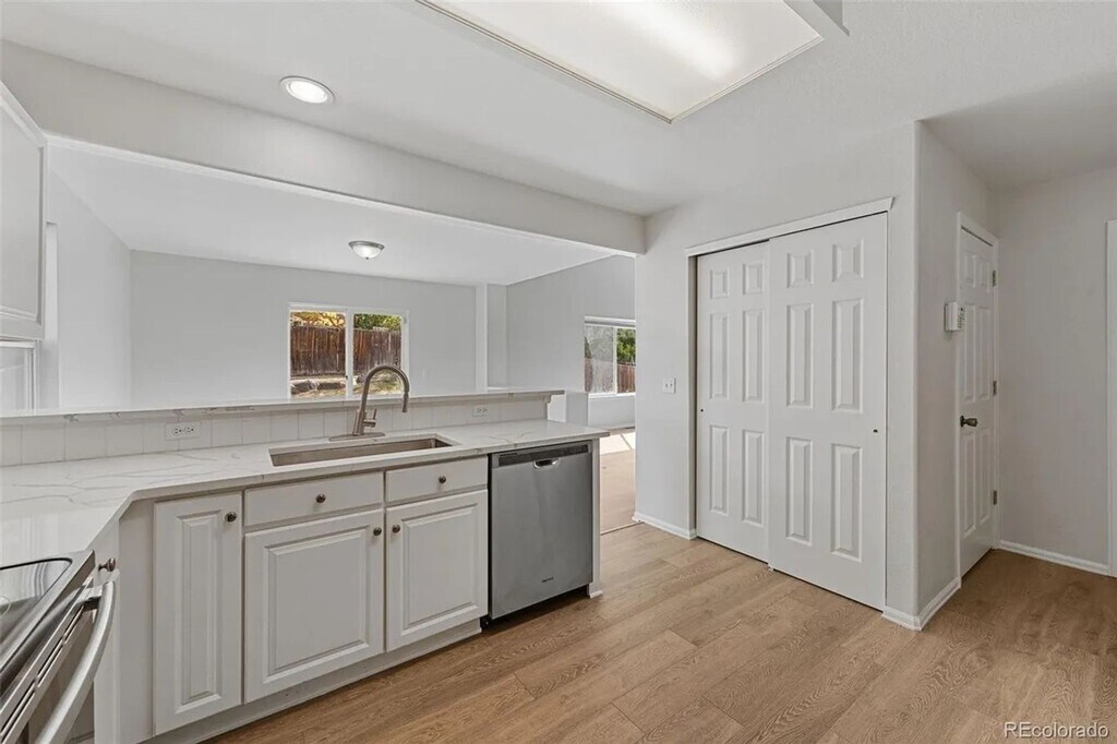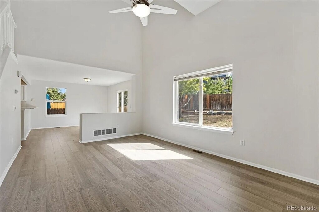 Welcome to this stunning home located in the vibrant city of Aurora, CO. This property boasts three spacious bedrooms and 2.5 bathrooms, providing ample space for comfort and convenience. The large living room, accentuated by vaulted ceilings and abundant natural light from numerous windows, seamlessly flows into an open kitchen. The kitchen is a chef's dream with stainless steel appliances, including a dishwasher, microwave, stove/oven, and refrigerator, and an abundance of cabinets and counter space. The primary bedroom features an en suite bathroom with a double vanity and a large walk-in shower. Additional amenities include a large unfinished basement offering endless possibilities, a large garage complemented by a spacious driveway, and ceiling fans for added comfort. Step outside to a large, fenced backyard, perfect for outdoor activities. This home is a perfect blend of comfort and modern living.