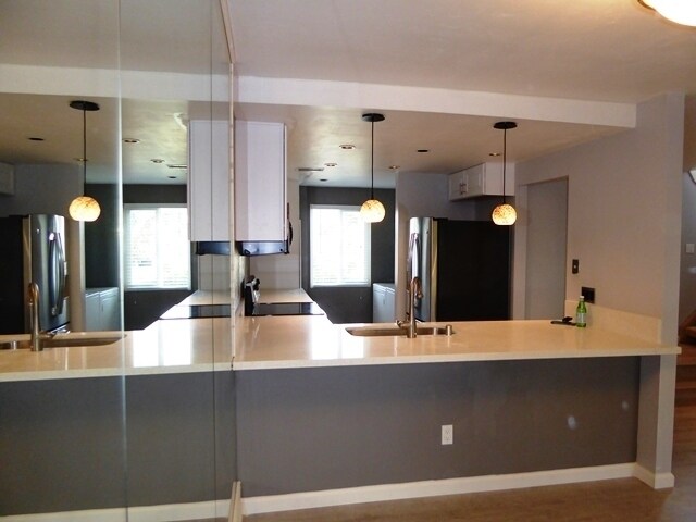 Upgraded end-unit townhome. Features include 2 bedroom 1.5 bath. Open floor plan. New Kitchen Cabinets, Quartz Counter Tops, and New Vinyl Wood Look Floors Downstairs. Custom paint, newer windows, stainless steel appliances. In unit full size laundry washer/dryer included as is the fridge. Private patio and balcony with slate details. A detached 2 car garage for your private use is also included. Close to beach, shopping and hiking trails.