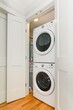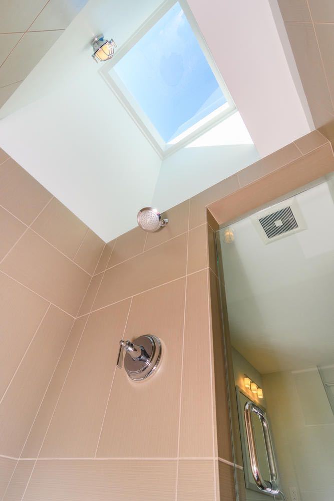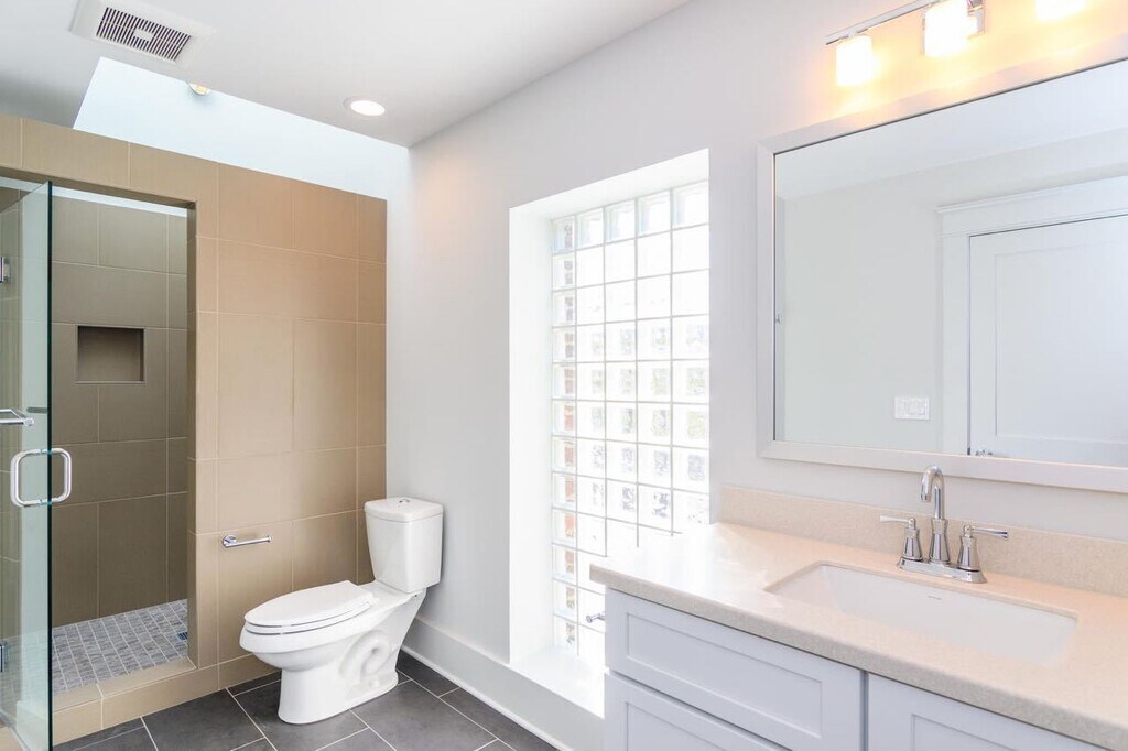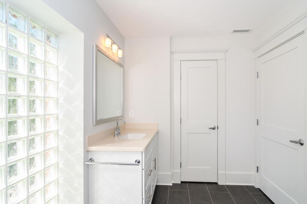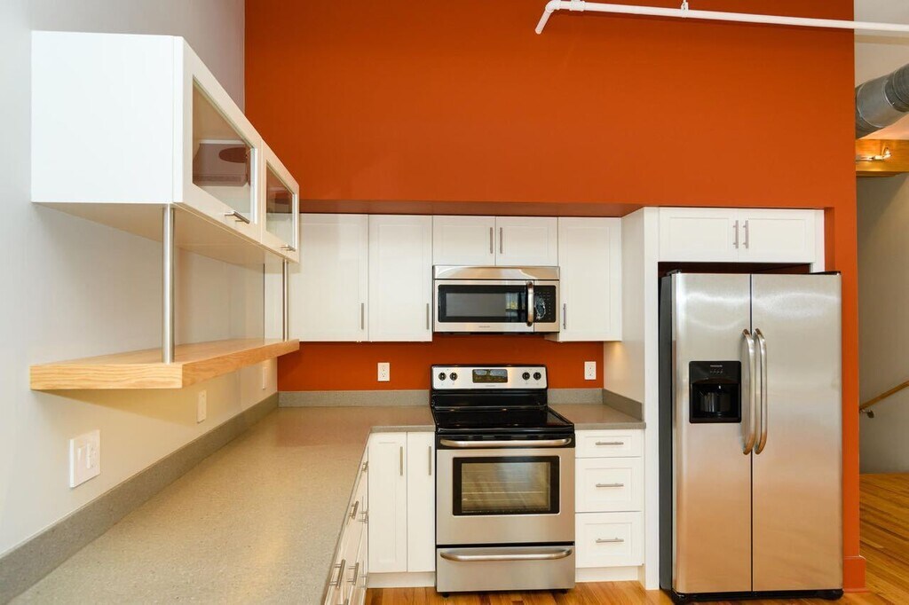 Modern and bright in the heart of downtown Asheville! This third floor walk-up apartment has a spacious great room with high, wood-beamed ceilings and east-facing windows overlooking Biltmore Ave. Beautiful oak floors are throughout. The open kitchen includes solid surface countertops, shaker-style cabinets, and stainless appliances including the electric range, built-in microwave, refrigerator, and dishwasher. The bedroom is spacious with great closet space and west-facing windows that overlook S Lexington Ave, Church St, and mountains beyond. The en suite bathroom, flooded with natural light from the huge glass block window and skylight, includes a beautifully tiled shower and large vanity. Off of the hall are the second full bathroom, also with a tiled shower, and the laundry closet - the full-sized stacked washer and dryer are included. A keypad entrance off of Biltmore Ave opens into the stairwell shared by the building’s three apartments. Central heat (electric) and air conditioning plus ceiling fans in the great room and bedroom. Water, sewer, and trash pickup included. Electricity is a tenant responsibility. Wired for Spectrum internet/cable, also a tenant responsibility. No parking included; monthly parking permits are available for a fee through the City of Asheville or through privately owned/operated garages and lots. No cosigners. No pets and no smoking.