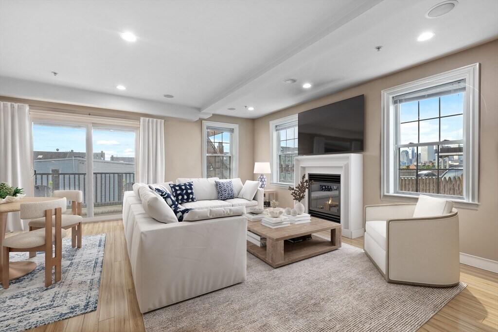 Perched atop coveted Thomas Park,this beautifully maintained condo offers stunning city views and refined finishes throughout. The spacious layout includes a large primary bedroom with an en suite bath,and custom walk in closet. Maple hardwood floors flow through the open-plan living area,complemented by a chef’s kitchen featuring granite countertops,stainless steel appliances,shaker cabinetry,and a breakfast bar. A striking chandelier highlights the dining area,while the living room showcases a fireplace and built-in surround sound. Step onto the oversized private deck and soak in breathtaking skyline views—an exceptional South Boston offering. MLS# 73436449