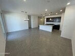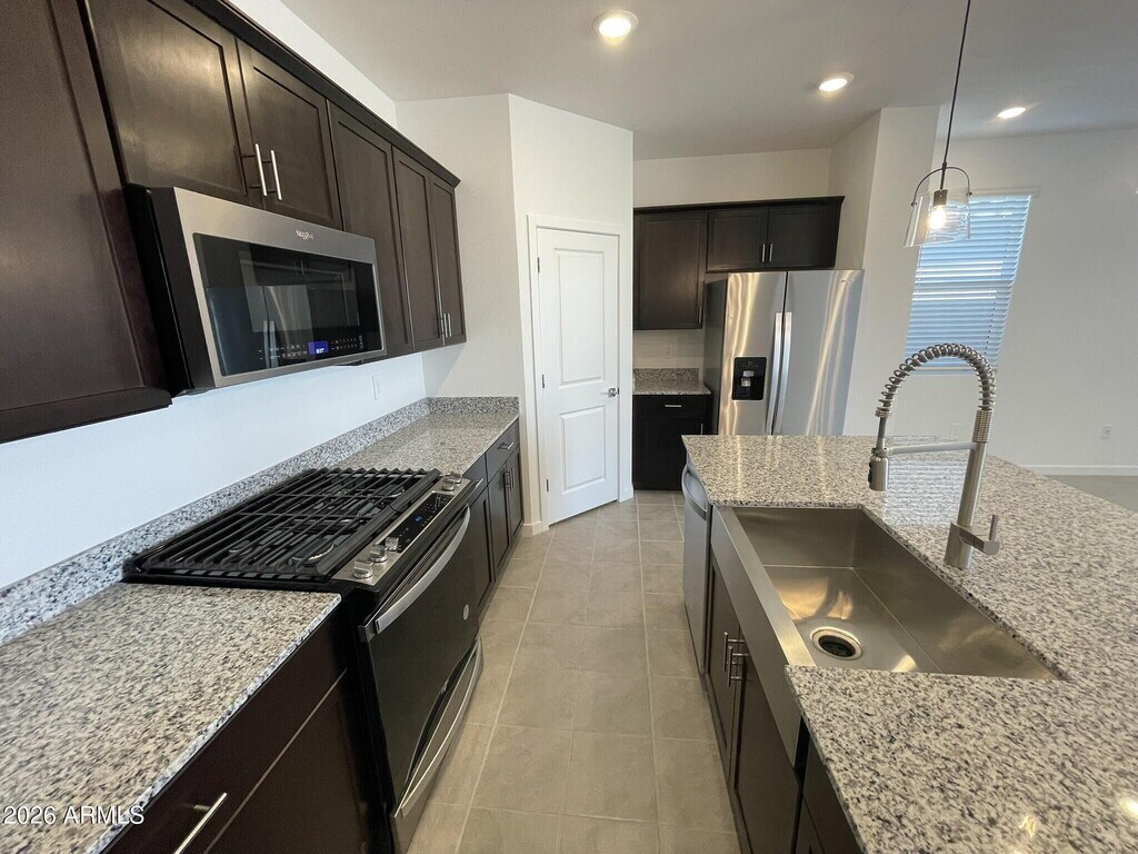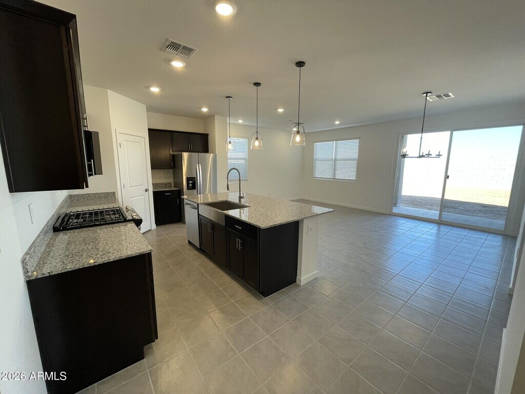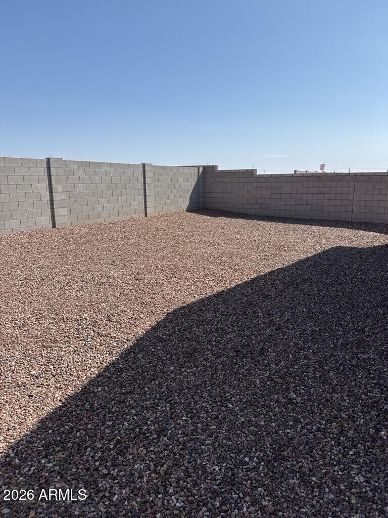 Three bedroom,two bathroom home offering 1,568 sq ft located on a corner lot in Maricopa. Open concept layout connects the living and dining areas to a kitchen featuring a gas range,farmhouse sink,oversized walk in pantry,and refrigerator included. Ceiling fans and slider blinds throughout. The primary suite includes a private bathroom with walk in shower,separate toilet room,and large walk in closet. Two additional bedrooms provide flexible space for everyday living. Washer and dryer included. Backyard features rock landscaping for low maintenance. Tenant responsible for landscaping and pest control. Community amenities include biking and walking paths,lake,children's playground,pickleball courts,pavilion,and BBQ areas.
