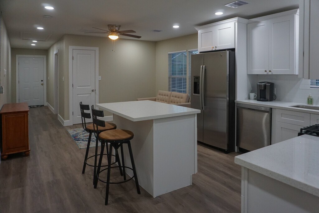 This beautifully renovated,fully furnished 1-bedroom home blends style and comfort. It features brand-new central A/C and heating,flooring,cabinets,countertops,sinks,toilet,tub,and stove. The home comes equipped with an in-unit washer/dryer,refrigerator,cookware,dishes,bedding,and furniture,making it move-in ready. Located in a secure,gated property near the East River development,it offers quick access to I-10 and I-69,just minutes from healthcare facilities and attractions like Discovery Green and Downtown Houston. Ideal for traveling nurses,digital nomads,and those in transition,the property is available for short-term rentals with a minimum stay of 1 month. Rent includes utilities (electric,gas,water,sewage,trash) capped at $150 and yard maintenance. No pets and no smoking are allowed. Corporate housing inquiries are welcome,and security cameras are installed on-site for added peace of mind. Enjoy a hassle-free living experience in a vibrant location! MLS# 11682210