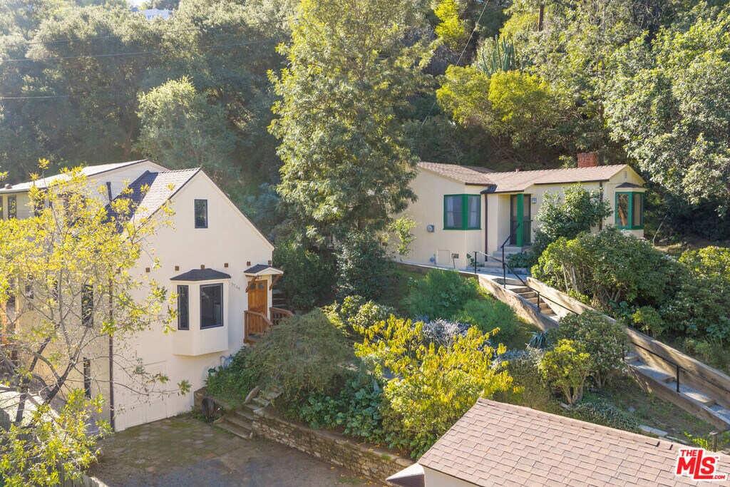 UNIQUE OPPORTUNITY! Enchanting hillside complex with 2 houses on 1 lot located in the Hollywood Hills West near Universal Studios. Ideal artist retreat / creative space for a Musician, Writer, Artist, Film / TV Editor, etc. Fantastic outdoor decks for entertaining guests. Ideal for an avid Gardener. Create your own Wonderland. // Primary (2-Story) Town House: Lower Floor: Enter into a bright spacious living room with wood floors. Open concept Dining area easily accessible to beautifully updated kitchen with stainless steel appliances and artistic colorful backsplash. Crisp bathroom with classic subway tiles and bathtub / shower plus linen closet. Upper Floor: Dreamy bedroom is a rustic wood paneled loft space with vaulted ceilings, cozy fireplace and scalloped-trimmed windows. Spacious armoire closet with drawers. Updated bathrooms with white subway tiles and blue accent tiles. Plus, 2 sinks and plenty of storage space. // Secondary (1-Story) Dream Cottage: Perfect for a work studio / office space or guests. Living room with bay window and decorative fireplace. Bathroom with vintage pink and white tiles complimented with classic subway tiles. Rustic kitchen with vintage tiles. Separate Dining Area off kitchen. Spacious bedroom with closet. Washer / Dryer for both houses. // One car detached garage with EV Charger with additional parking space with 2nd EV Charger. RV / Boat parking available. Outdoor patio with fenced-in pet-friendly yard. Bountiful storage underneath the main house. Magical bridge walkway to secondary house. Convenient central location. Close to Universal Studios / City Walk, NBC Universal. Easy access to 101 FWY and Ventura Blvd teaming with restaurants and shops. MLS# 25627417