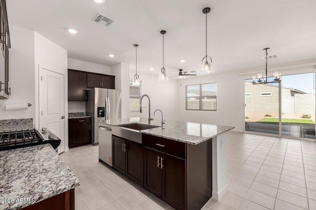 Take advantage of this fantastic rental opportunity! This lovely 3-bedroom home features an appealing great room with high ceilings,a soothing palette,blinds,and durable tile flooring. The gourmet kitchen boasts granite counters,ample wood cabinetry with crown moulding,chic pendant lighting,stainless steel appliances,a walk-in pantry,and an island with a breakfast bar for casual dining. The primary bedroom showcases soft carpeting,an ensuite with double sinks,and a convenient walk-in closet. Unwind at the end of a long day in the backyard,which offers a covered patio,pristine artificial turf,and stylish pavers. Don't miss out on this one!
