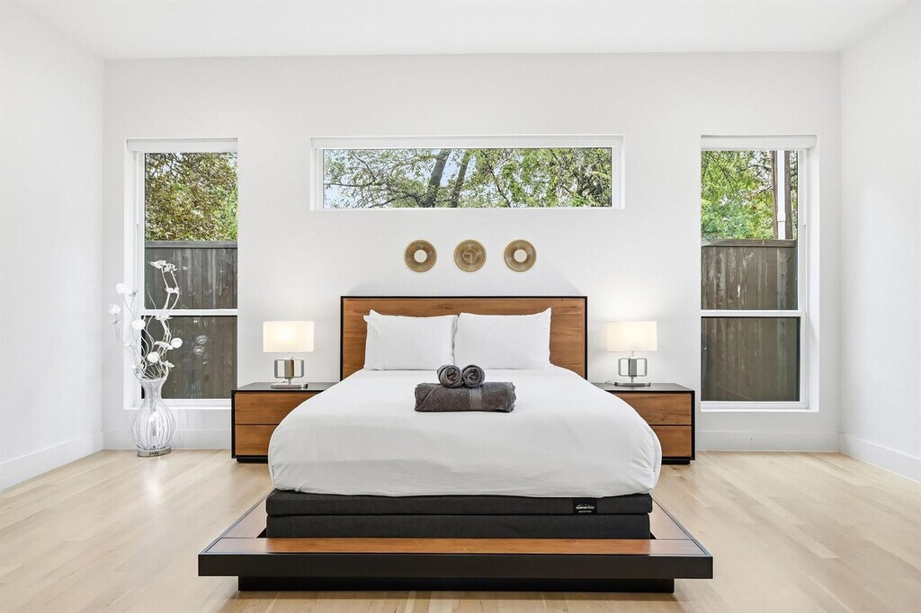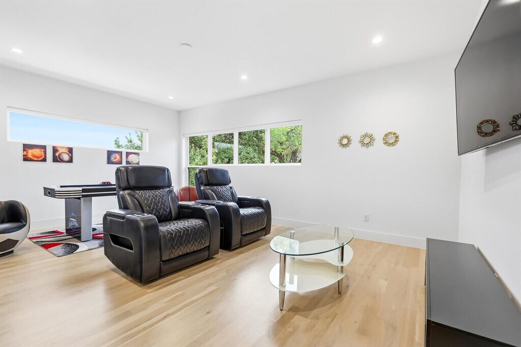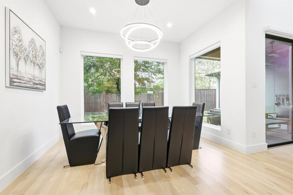 Feel at home in this modern, luxurious vacation home, filled with high-end finishes. This property offers 4 bedrooms, sleeps 8, and provides an escape from daily life with impeccable attention to detail. The fully equipped kitchen features sleek cabinets, modern fixtures, stainless steel appliances, an oversized kitchen island, and a mini fridge. The dining room offers an elegant space with plenty of natural light and a dining table with seat settings for 8 guests. The living room features lofty high ceilings, comfortable furnishings, modern seating, an electric fireplace, a flat-screen TV, and high-speed Wi-Fi. For entertainment, there is a cinema room with theater-style seating, an air hockey table, and a mini-fridge. A fully fenced backyard with a patio, conversation set, and BBQ grill are also available. Free parking and laundry (washer and dryer) are included. House-trained pets are welcome with a non-refundable pet fee of $150 per pet (maximum of 2 pets per stay). Located only 15 minutes from downtown, this beautiful vacation home offers all the amenities of home while being only minutes from Dallas’ prime attractions. Dallas is home to more than a dozen neighborhoods and districts that each have their own distinct vibe and attractions. Nearby attractions include The Sixth Floor Museum at Dealey Plaza (16 min drive), Reunion Tower (16 min drive), Perot Museum of Nature and Science (15 min drive), Deep Ellum (23 min drive), and Dallas Arboretum Botanical Gardens (21 min drive). Smoking of any type is not allowed, and violations are subject to a $450 fine plus the cost to clean, deodorize, and repair damages. No parties or events are allowed. Check-in is at 4pm and check-out is at 10am. [SI]