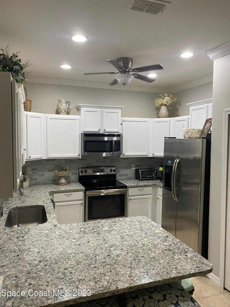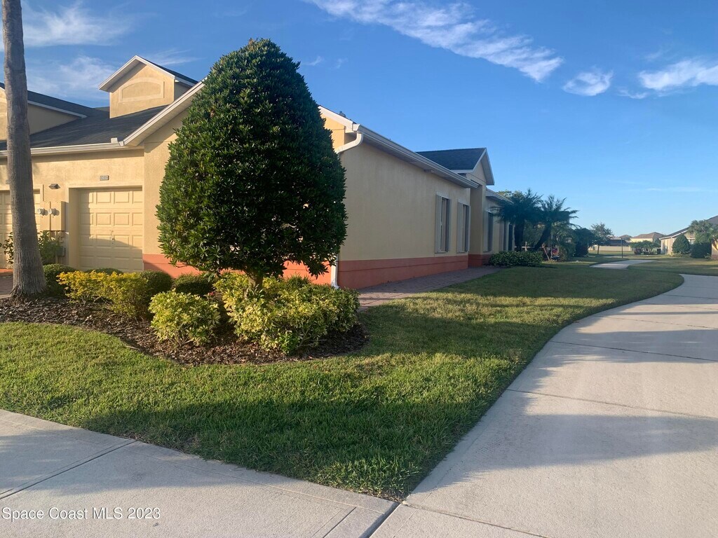 Welcome to Heritage Isle premiere 55+ community in Viera. This beautiful updated end unit built in 2014 offers 1,537 sq ft,2 bedrooms,2 baths plus multi purpose flex room (could be den,office,craft room or 3rd bedroom w/ extra storage) & 1 car garage. Kitchen has quartz counters,backsplash,& S. S appliances & large pantry. Laundry room w/ washer & dryer. Master bedroom has custom closet w/ built in's. Plantation shutters adorn the tinted windows & hurricane accordion shutters protect the exterior. Crown molding in kitchen,DR,LR & master bedroom. Enclosed screened lanai that leads out to paver patio & next to walking trail. Enjoy the good life w/ state of art clubhouse,restaurant,heated pool,and daily activities (fitness center) for the active senior. Lawn care included.